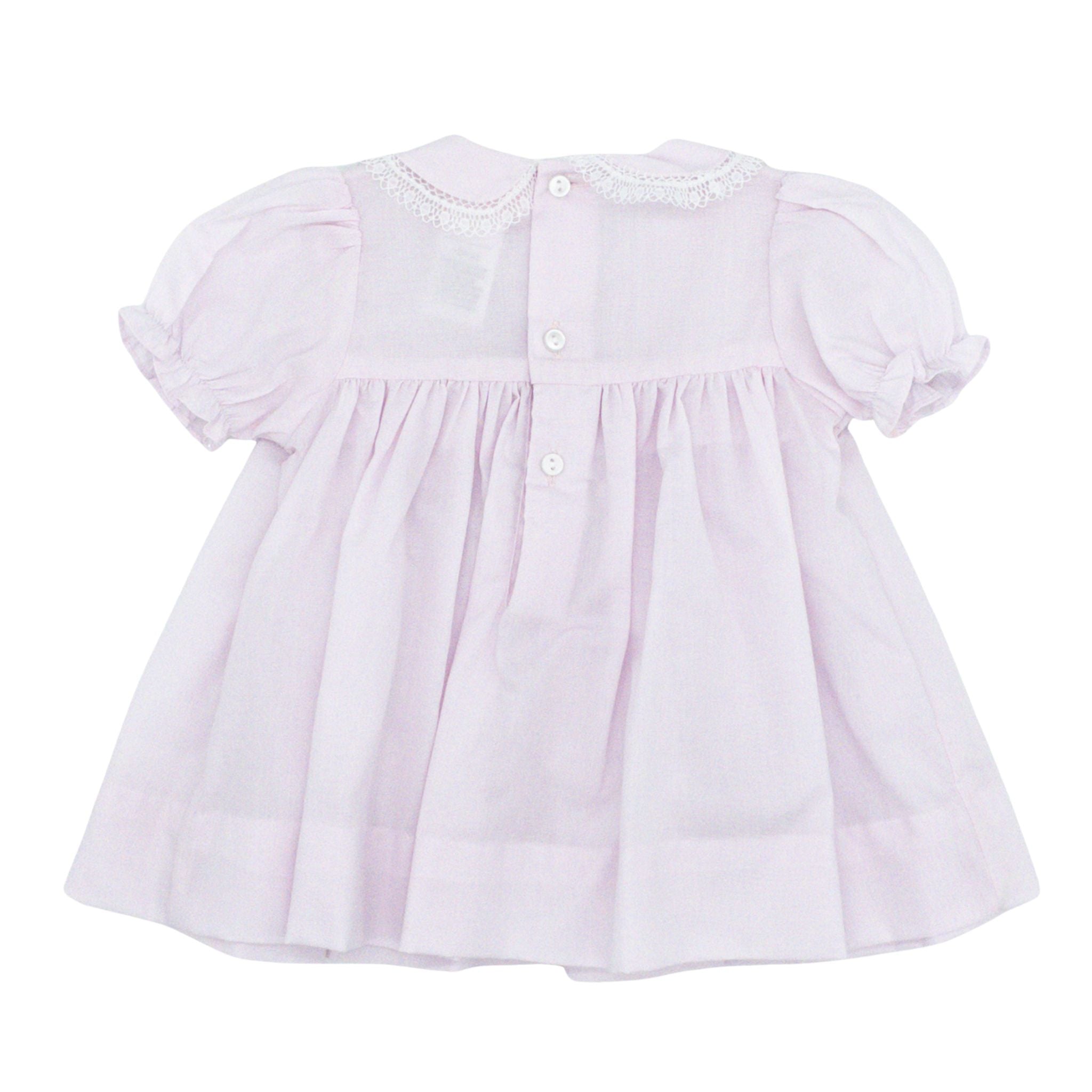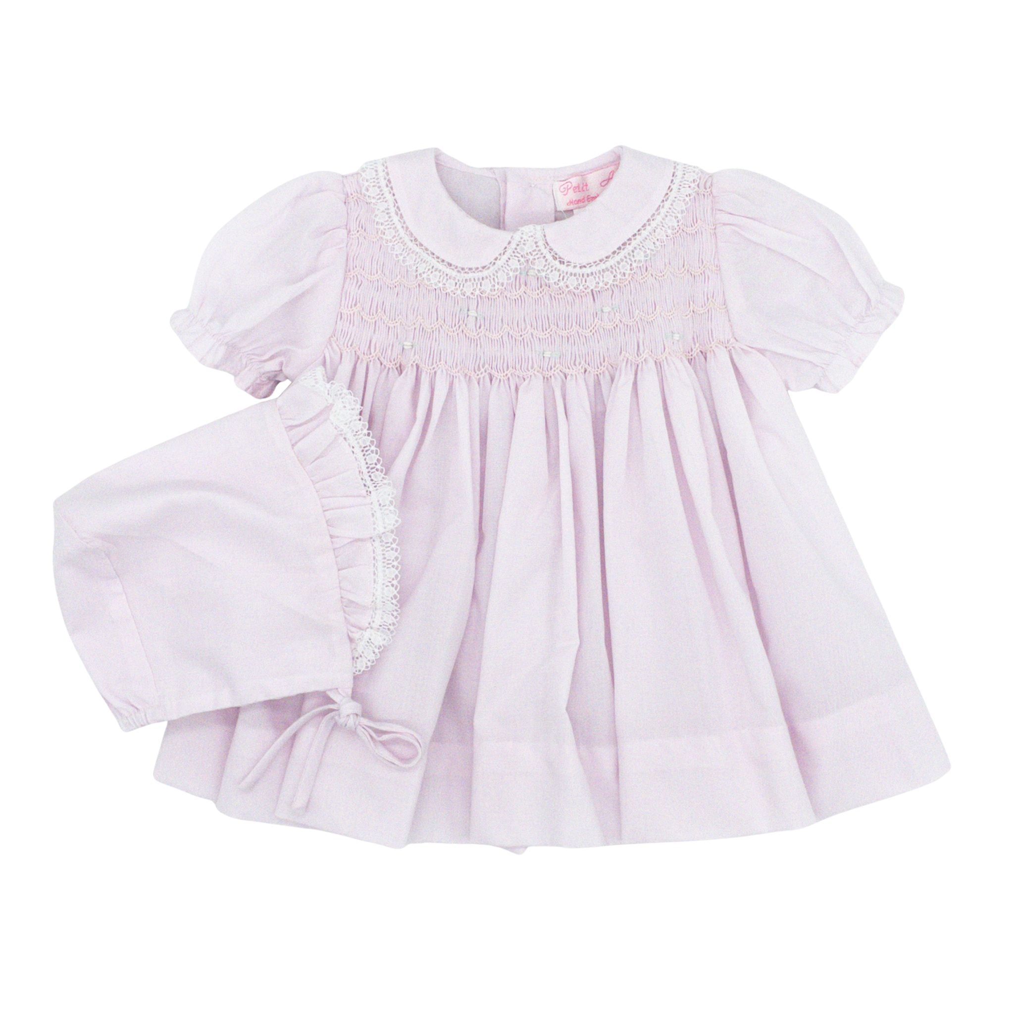 Introduce timeless elegance to your little one's wardrobe with this delightful three-piece ensemble! The smocked dress features subtle floral embroidery across the smocking, a lace-trimmed collar, and charming puff sleeves. Coordinating pieces include a matching pink diaper cover and a sweet lace-trimmed hat, creating a picture-perfect set for any occasion. From milestone moments to everyday playtime, this collection brings joy and sophistication to her precious wardrobe.
