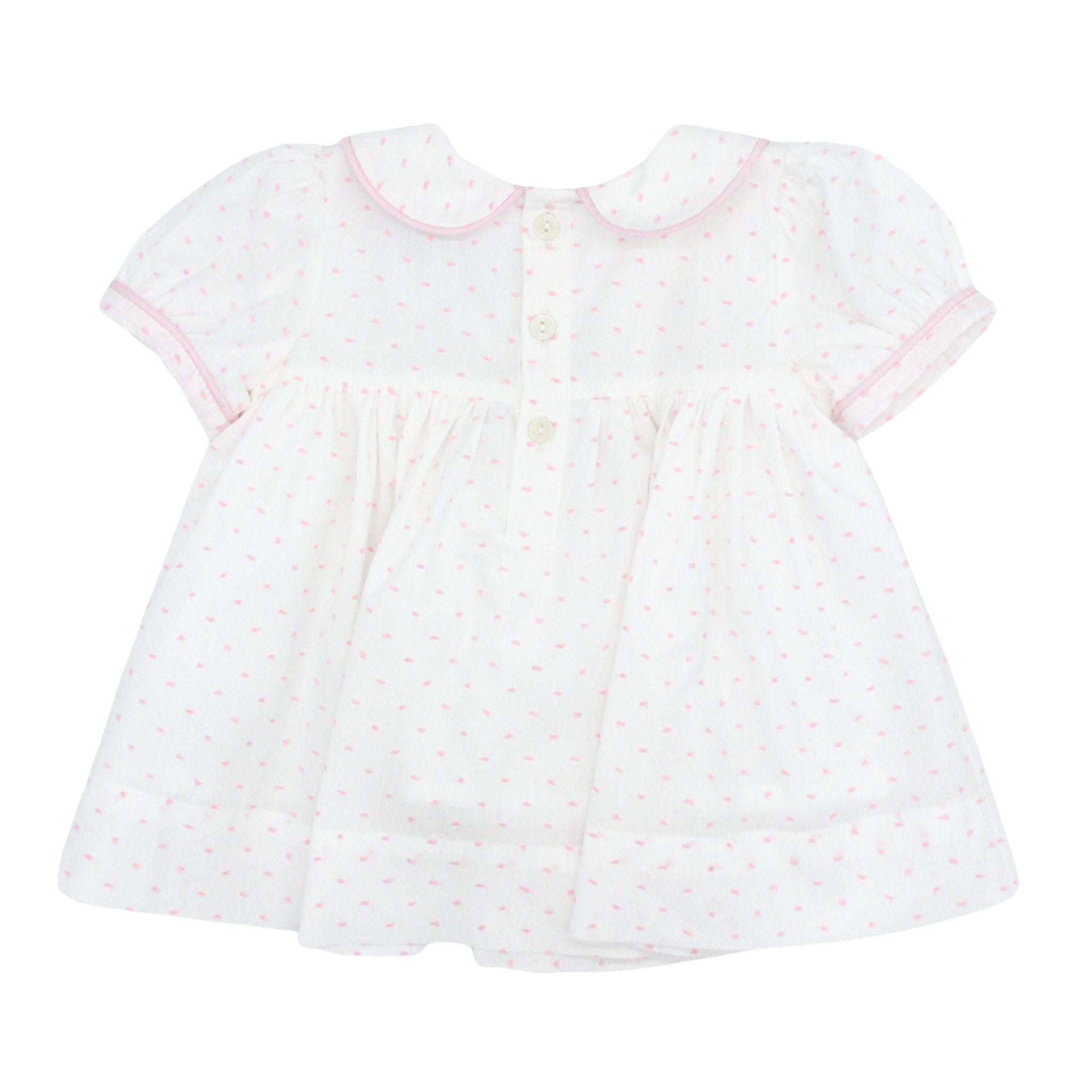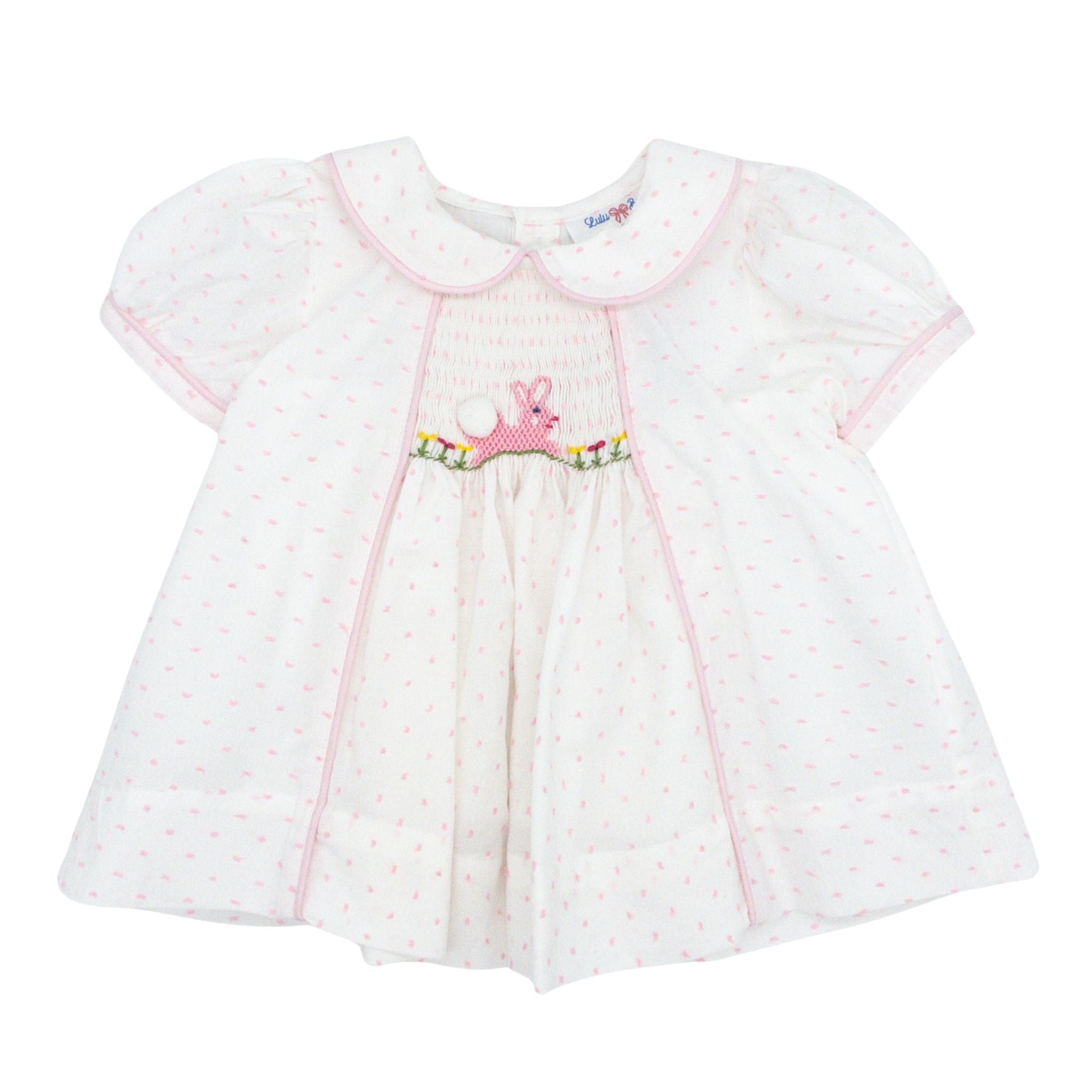Adorable pink Swiss dot dress featuring hand-smocked bunny and flower details. Delicate pink piping trims the collar, sleeves, and front placket for a polished finish. Perfect for Easter celebrations, spring photos, or any special occasion. The timeless smocking technique and charming motifs make this dress a cherished keepsake piece!