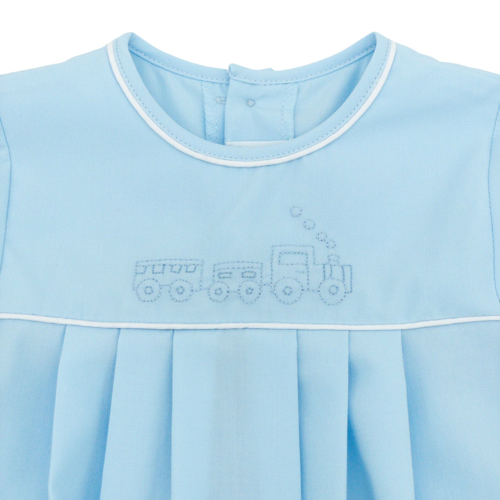 Choo-choo! This adorable bubble features soft blue fabric with hand-embroidered train details on the front. Crisp white piping adds a polished touch that makes this piece extra special. Your little one will look precious in this sweet, thoughtfully crafted piece.