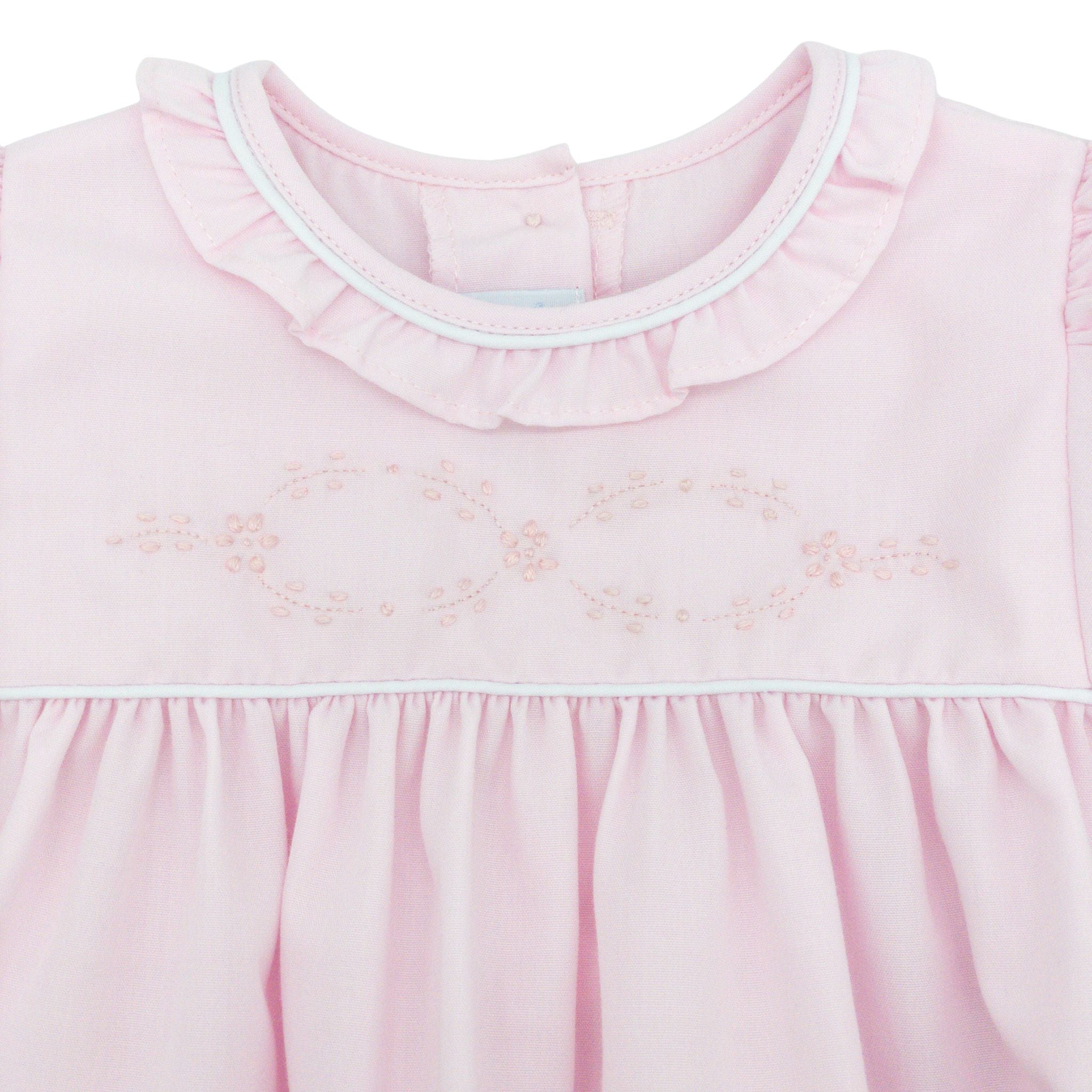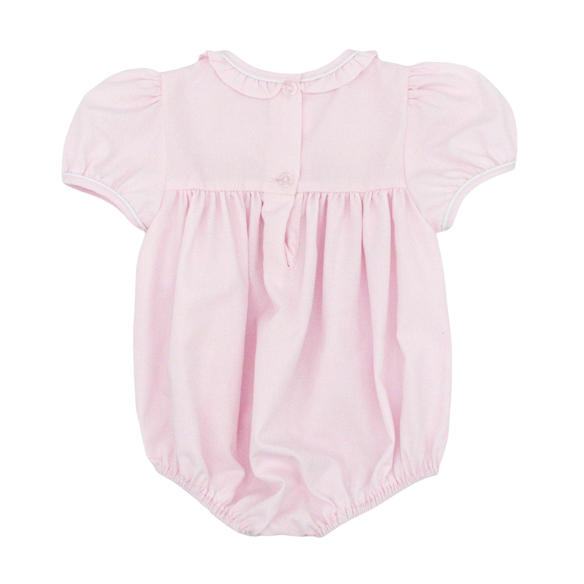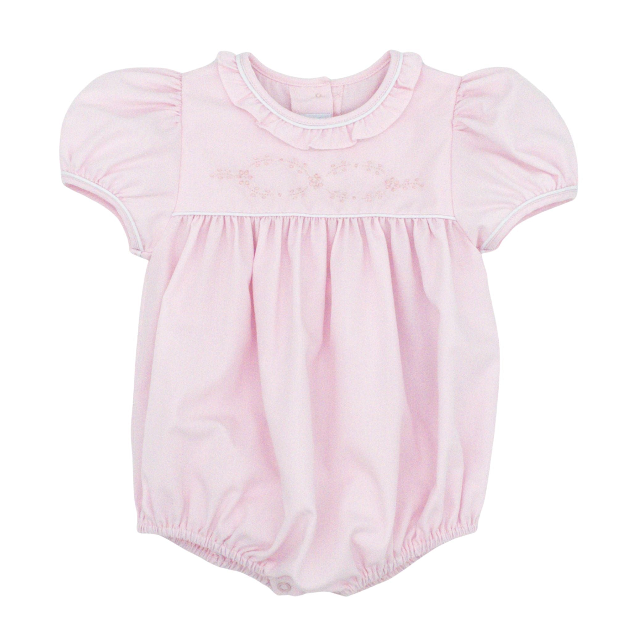 This precious bubble is pure joy wrapped in pink! Adorable ruffled neckline details frame her face with sweetness, while intricate hand-embroidered flowers create a delightful bow across the fabric. A sweet choice for a sweet little girl!