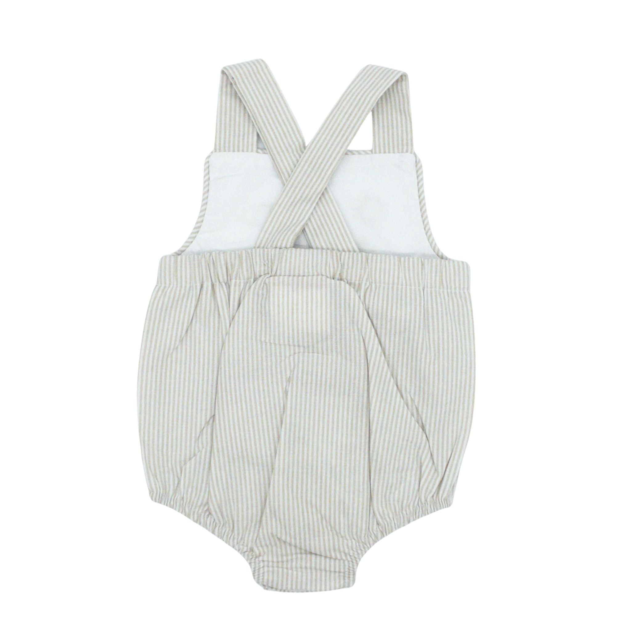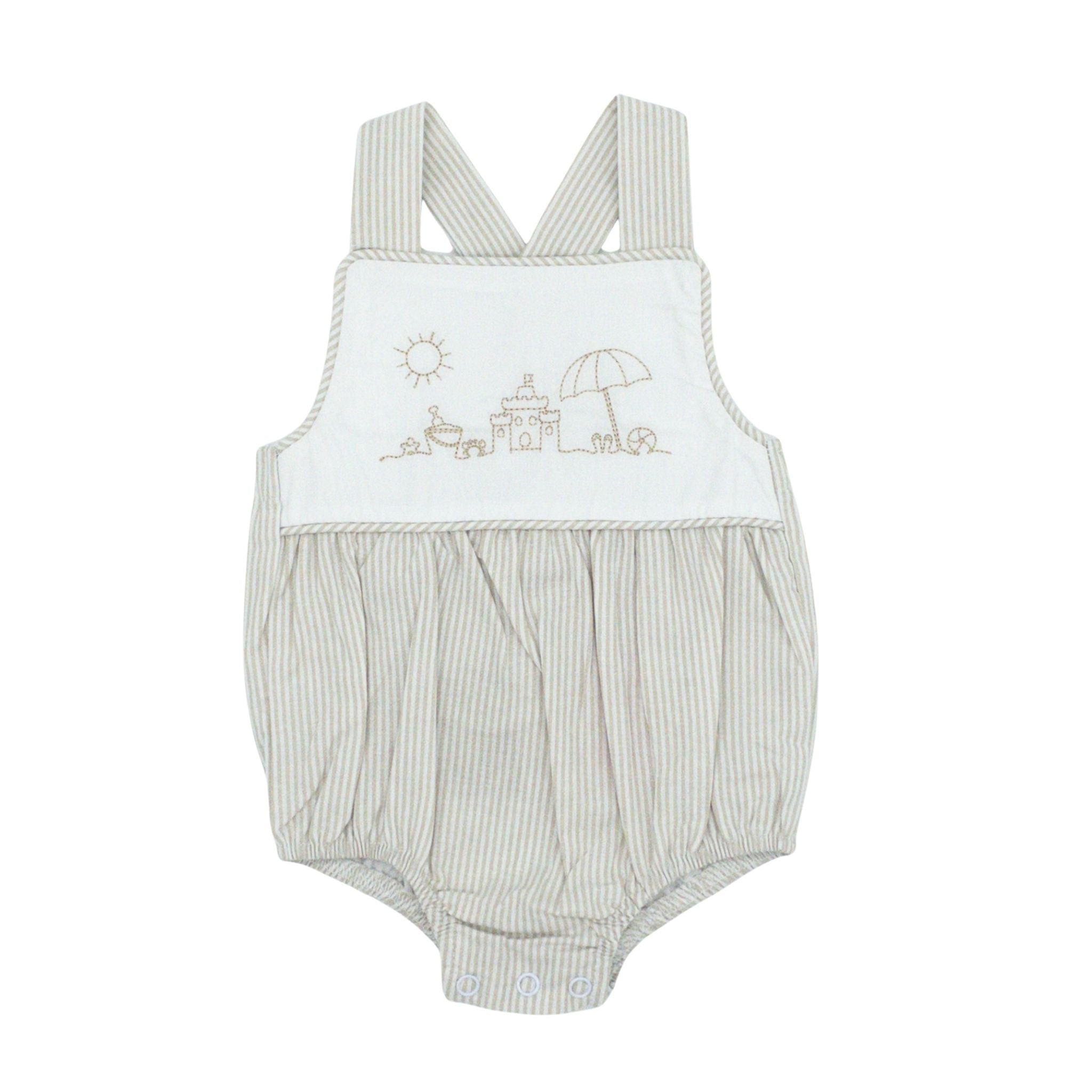 Dive into summer style with this tan striped bubble featuring delightful beach embroidery. The design showcases a beachy scene complete with a sandcastle, umbrella, and bright sun—perfect for capturing the carefree spirit of a day on vacation. Ideal for little ones who love the sun and sand, this bubble combines comfort with playful seaside flair that celebrates all the fun of summer adventures!