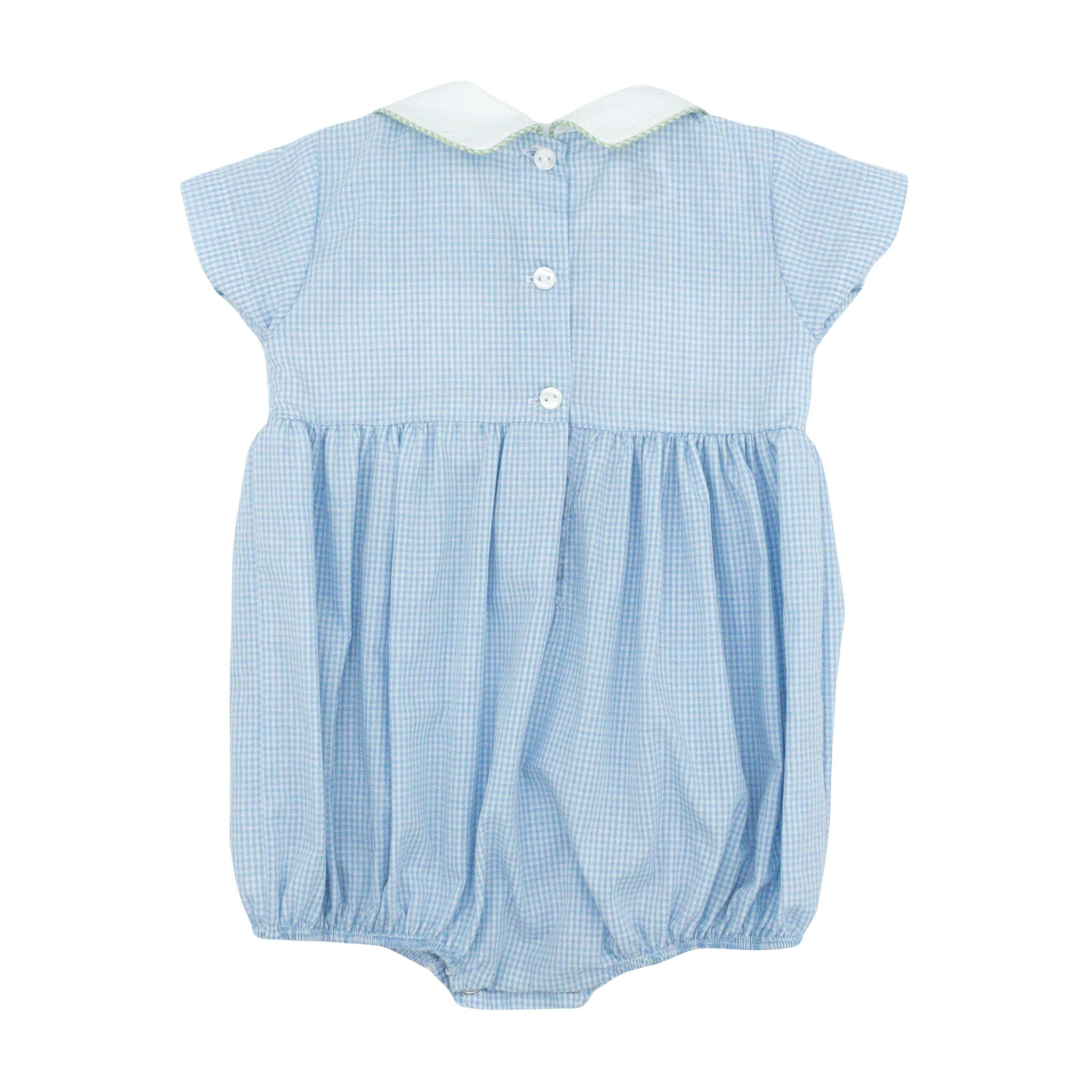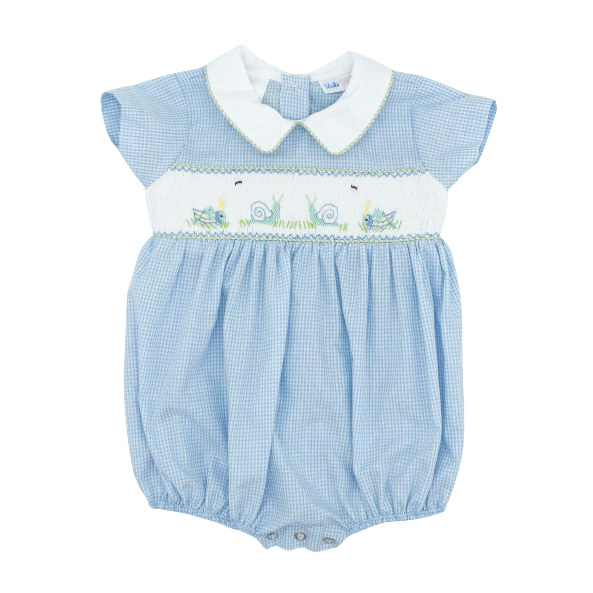 Introducing the Noah Bubble—a delightful summer staple bursting with personality! Hand-smocked snails and crickets frolic across the front, while soft blue gingham and green piped trim create a picture-perfect look with Southern flair. Sweet, spirited, and utterly timeless for those sunny days ahead!