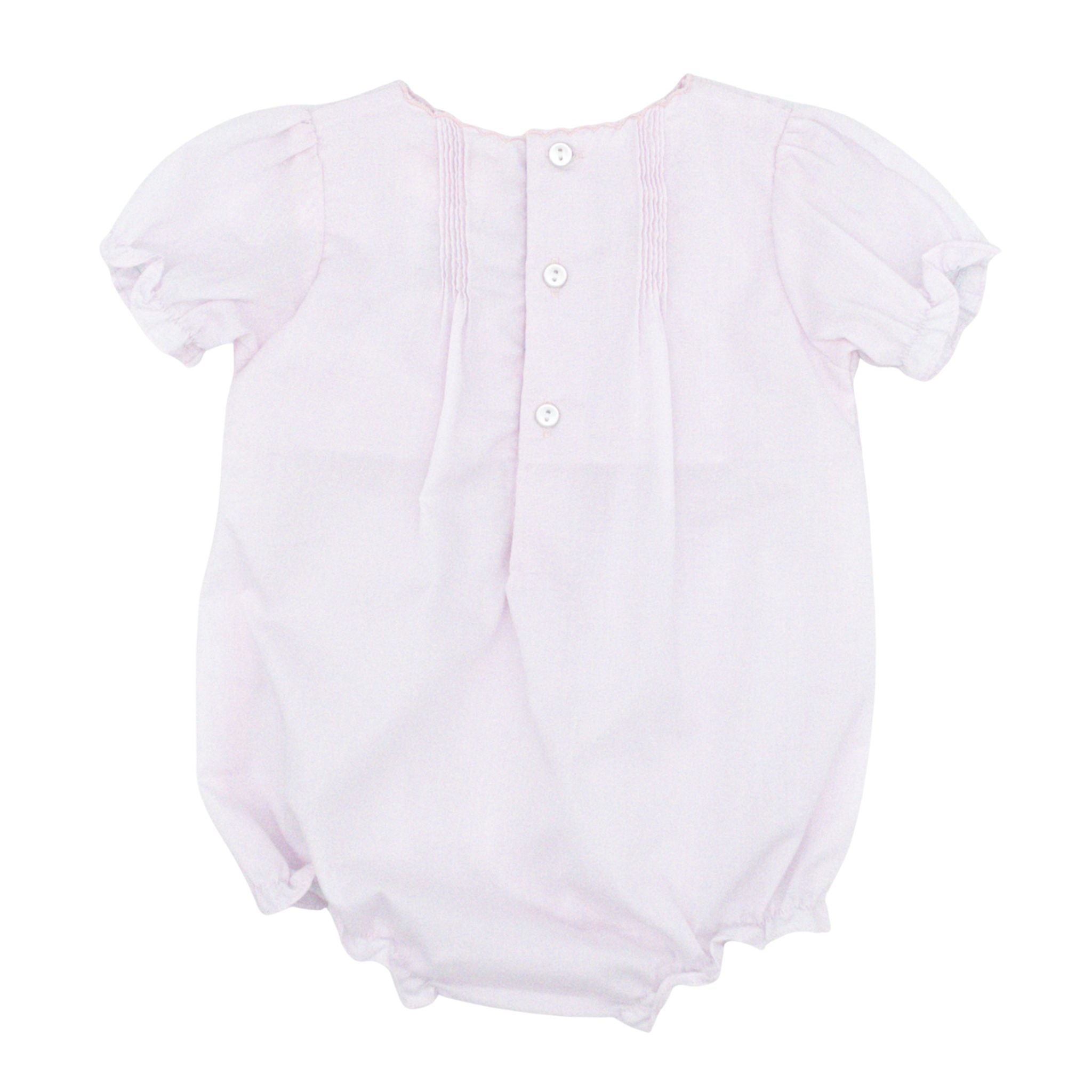 Dress your little girl in pure sweetness with this enchanting pink bubble outfit! Soft pleats and embroidered details create a whimsical charm, while an adorable flower design graces the chest. The scallop-trimmed collar brings a touch of sophistication, and the matching hat—adorned with its own delicate flower embroidery and playful ruffle trim—completes this picture-perfect set. An absolute treasure for any special occasion or everyday adventures!