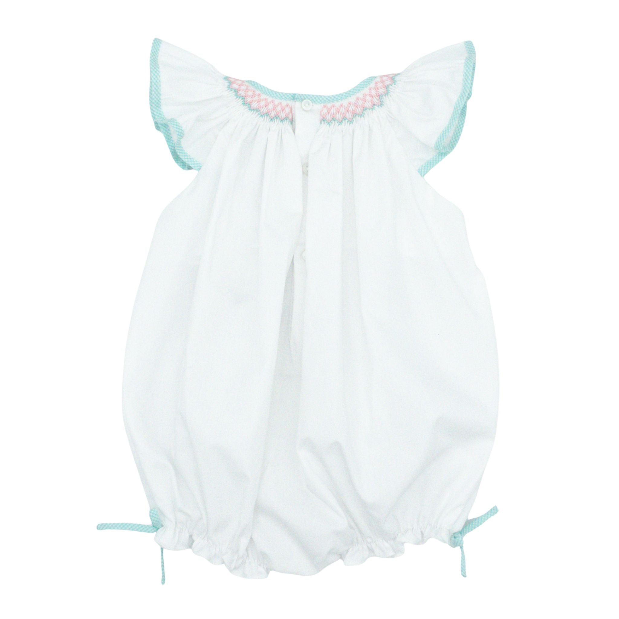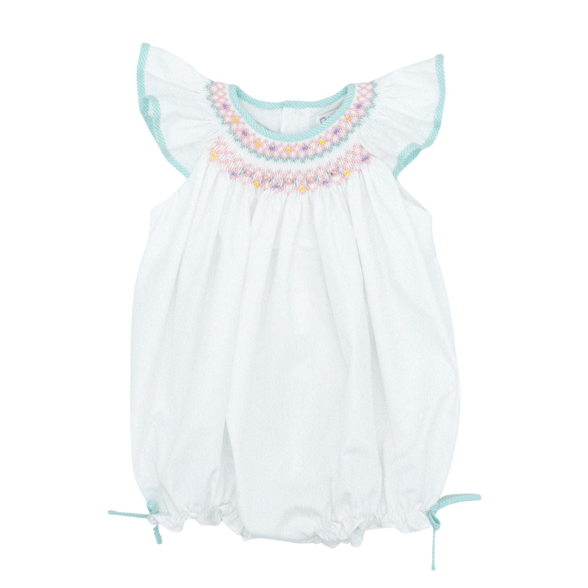 This adorable bishop bubble is pure sweetness! Featuring delicate angel sleeves and charming turquoise gingham trim along the neckline, sleeves, and leg bow accents, it's the perfect choice for your little girl. The smocking showcases cheerful spring colors that tie the whole look together beautifully. Perfect for special occasions or everyday elegance, this white bubble combines classic style with whimsical details that every girl will love.