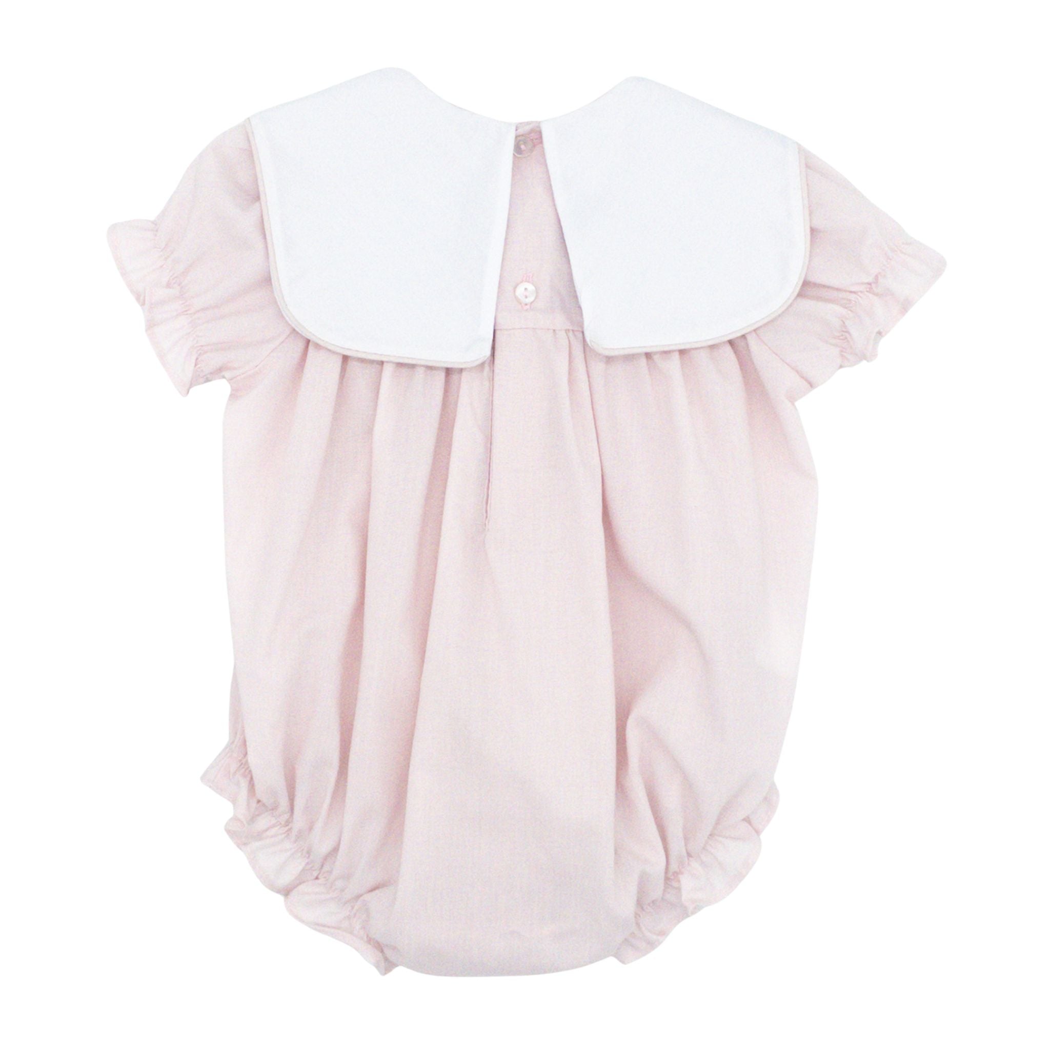 Meet the sweetest addition to her wardrobe! This pink bubble pairs soft fabric with playful ruffled details at the sleeves and legs. The crisp white square collar is ready for your personal touch—monogram it to make it uniquely hers. Perfect for celebrations, photo sessions, or those moments when you want her looking absolutely precious. A timeless piece that's as comfortable as it is adorable.