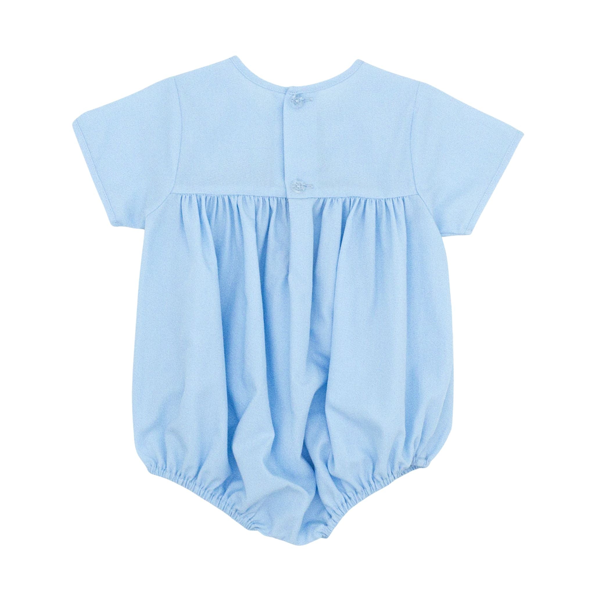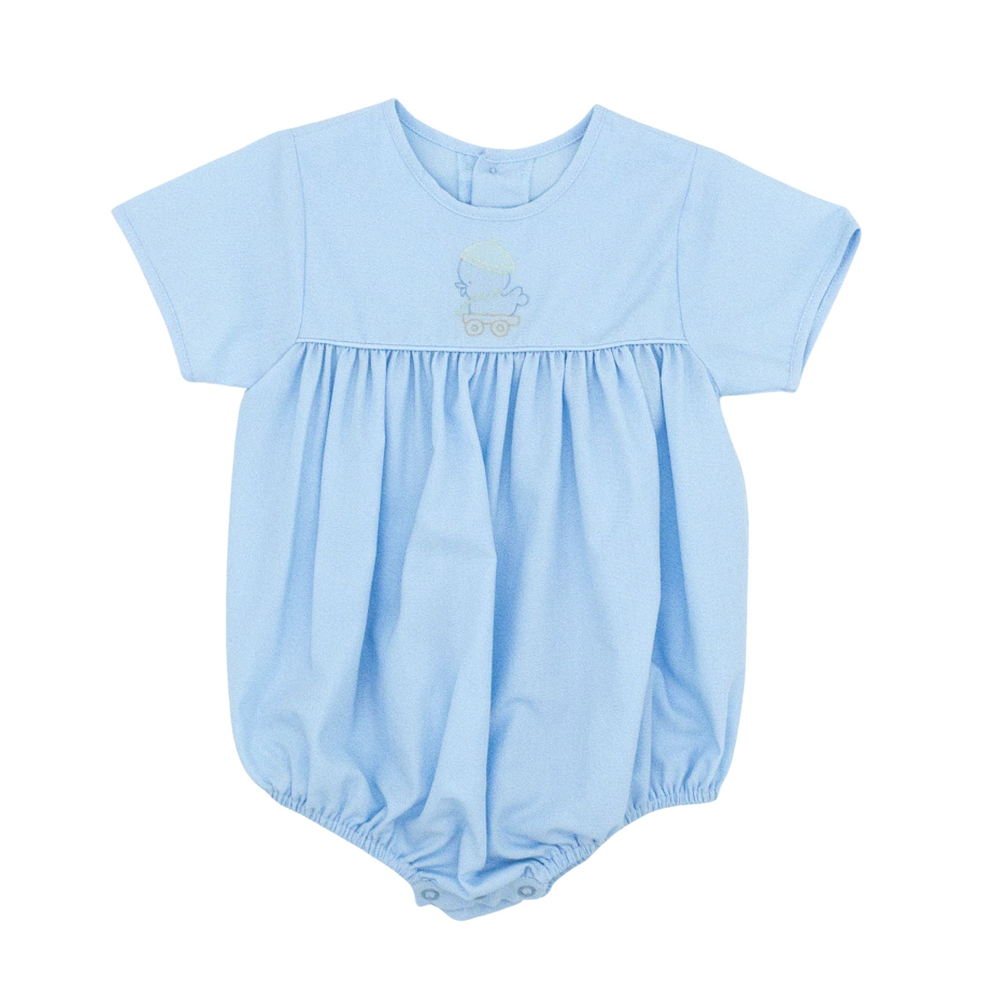 This delightful blue bubble features hand-embroidered details that bring joy to any wardrobe. A precious chick rides in a tiny wagon, with each stitch showcasing thoughtful craftsmanship and careful attention. Soft fabric and whimsical design make it perfect for everyday moments. Give your little one something special and wonderfully made!