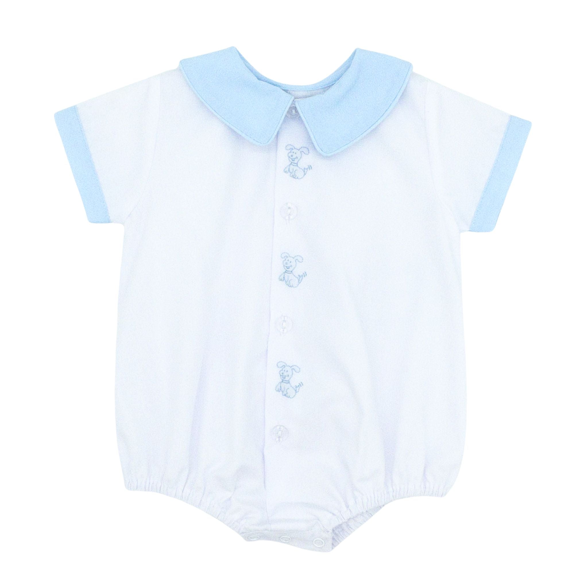 Elevate baby's wardrobe with this sweet bubble white. A blue collar and coordinating sleeve trim frames the piece, while delightful hand-embroidered "Sitting Dogs" add personality to the front placket. This timeless design is a must-have piece!