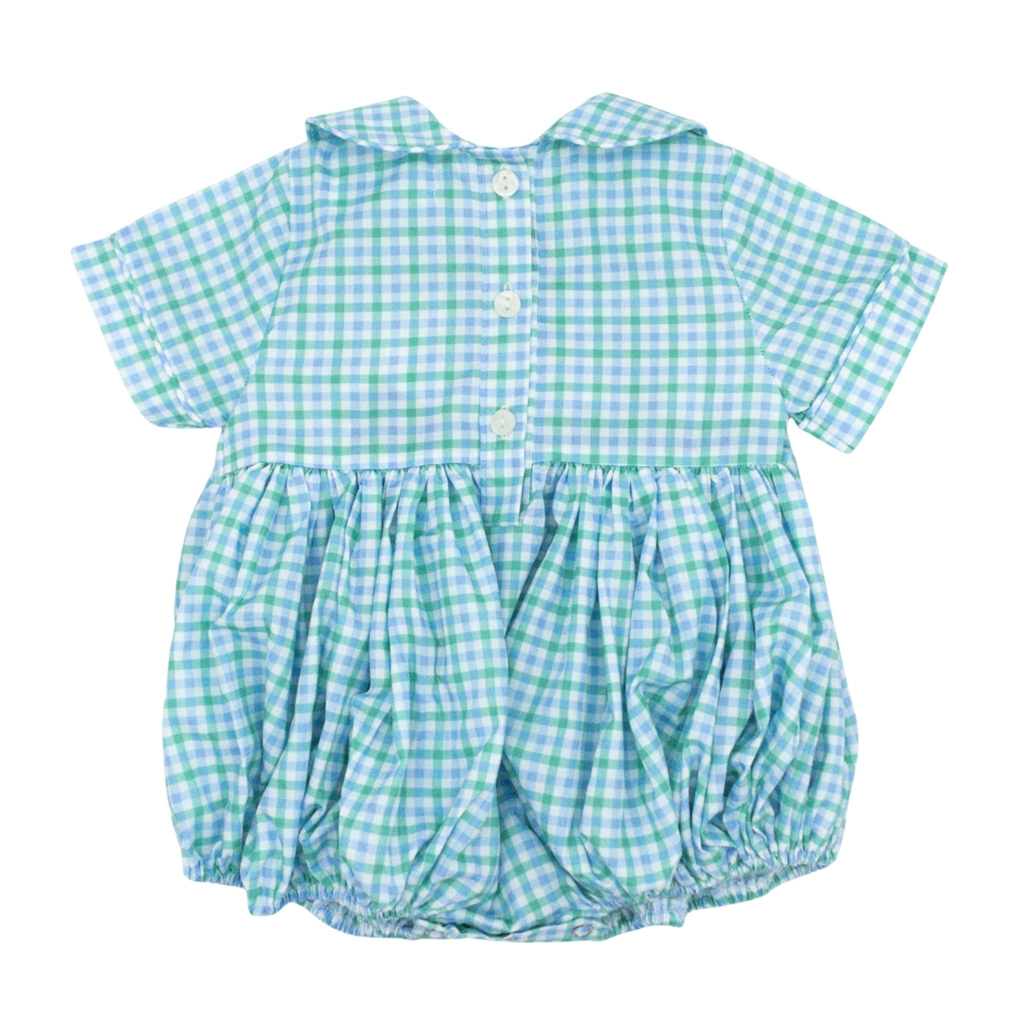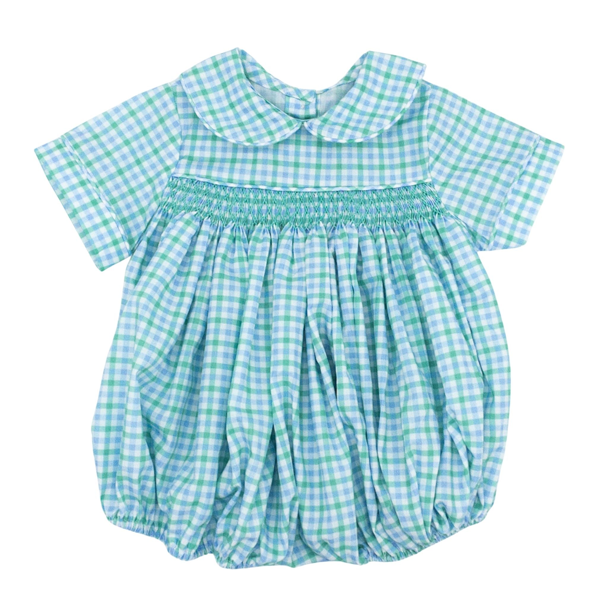 Classic elegance meets playful charm in this hand-smocked bubble featuring a striking blue and green plaid pattern. Geometric smocking adorns the chest, creating beautiful texture. The timeless Peter Pan collar adds a touch of sophistication perfect for church services and special occasions. Lightweight and breathable, this piece is an ideal choice for spring and summer celebrations. A versatile wardrobe essential that transitions beautifully from formal events to everyday wear!