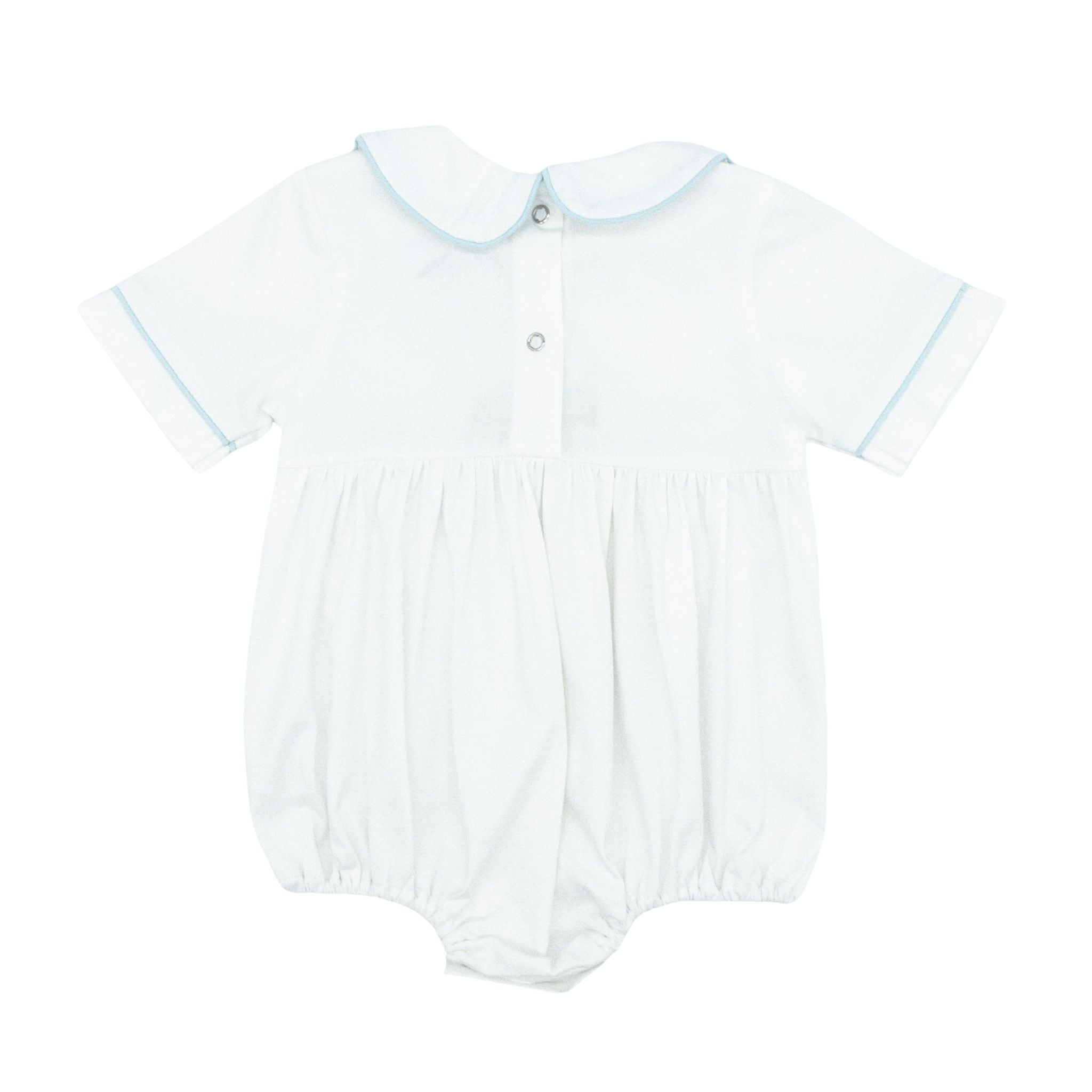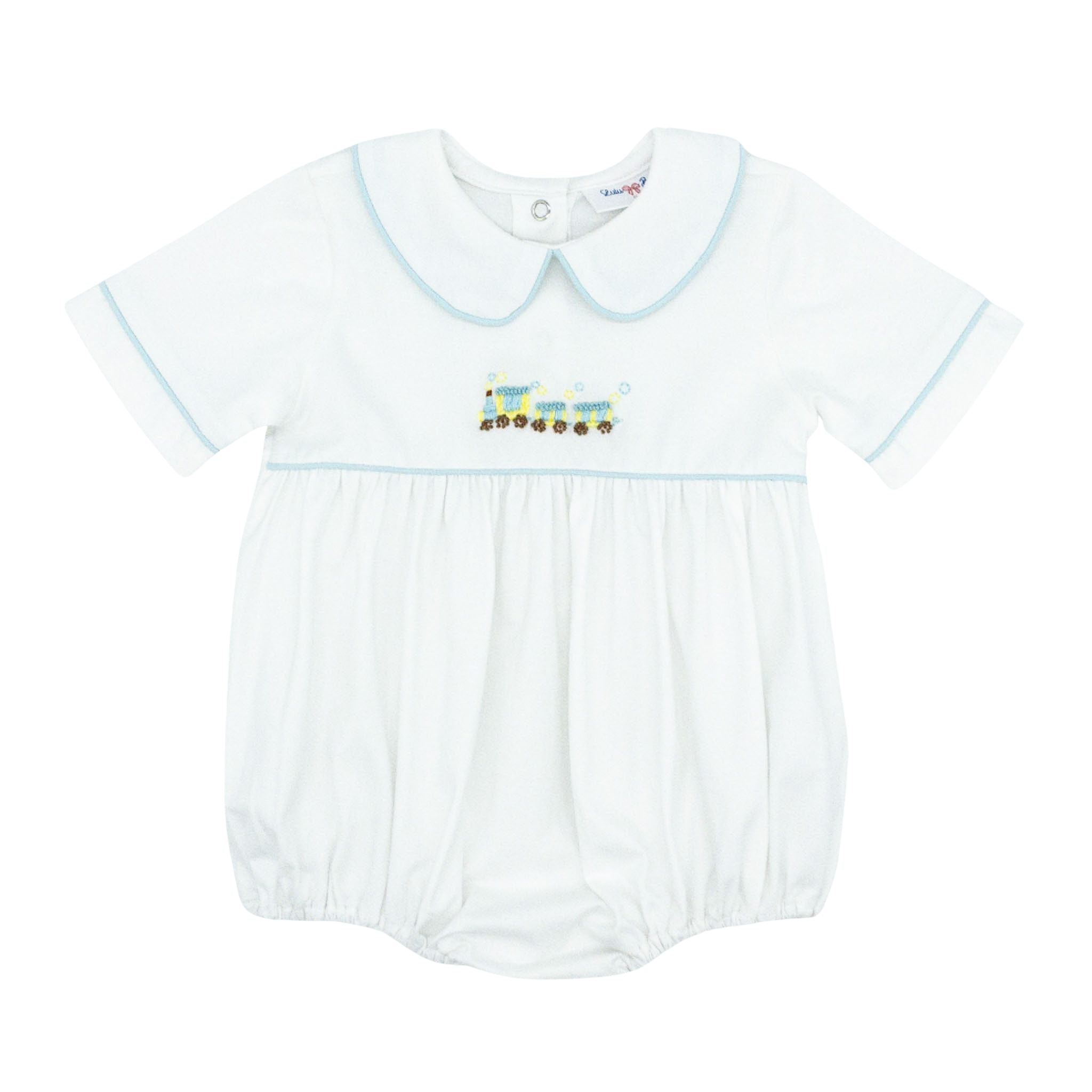Adorable knit bubble featuring a train embroidery design. Crafted from soft white knit fabric with light blue piping accenting the collar, sleeves, and bodice. This bubble is a sweet choice for your little boy's wardrobe—comfortable, stylish, and ready for playtime or special occasions!