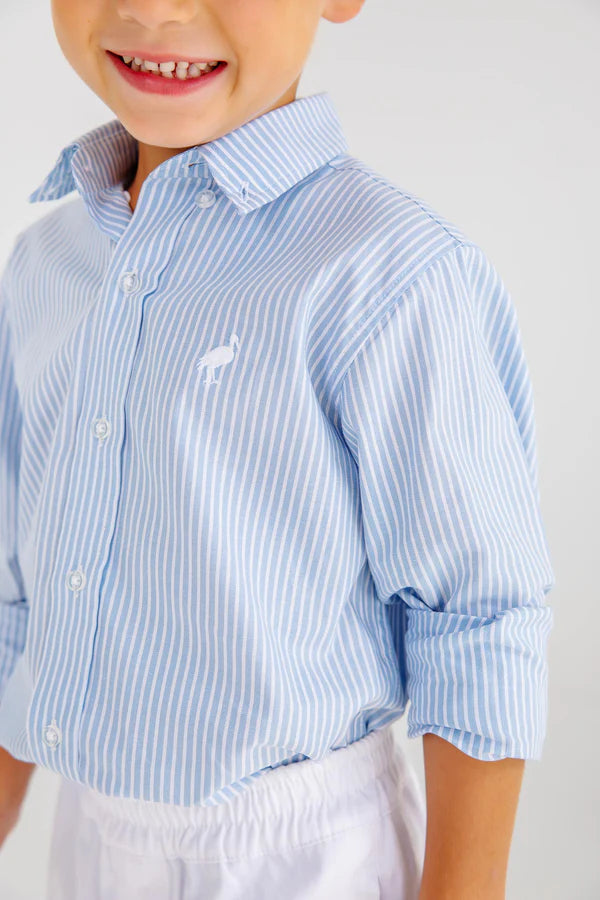 The Dean's List Dress Shirt in Barrington Blue Tally Ticking Stripe with Worth Avenue White brings timeless preppy style to his wardrobe. This classic boys' dress shirt features crisp stripes and quality tailoring that's perfect for special occasions, school events, or any time he needs to look his best. Designed with attention to detail and crafted for all-day comfort, it pairs beautifully with dress pants, khakis, or coordinating pieces for a polished look.
