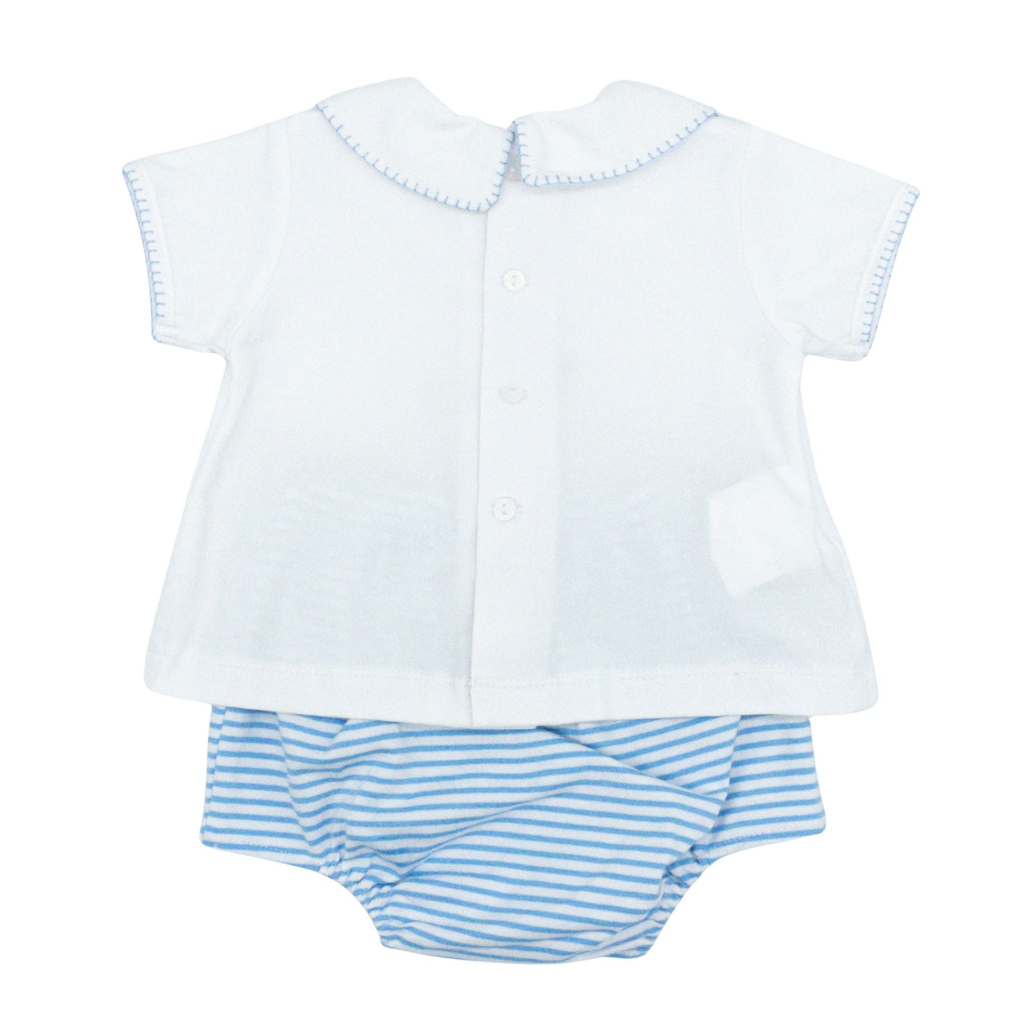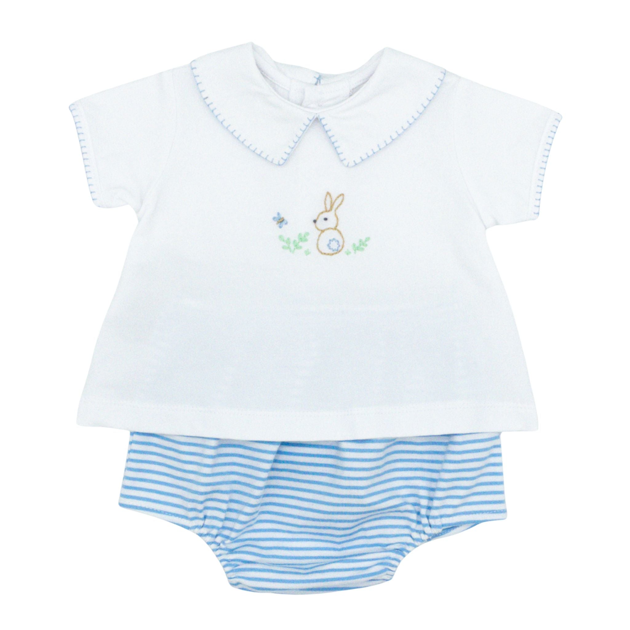 Hop into spring with the Bailey Knit Diaper Set, featuring an adorable embroidered bunny design perfect for Easter celebrations. This two-piece set includes a soft shirt with delicate picot trim on the collar and sleeves, paired with a coordinating striped diaper cover. The Little Cottontail embroidery adds a festive touch that'll have everyone smiling. Crafted for comfort and style, it's an ideal choice for your little one's special occasions and everyday adventures.