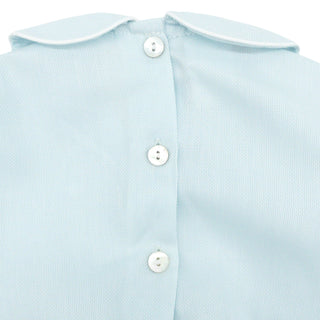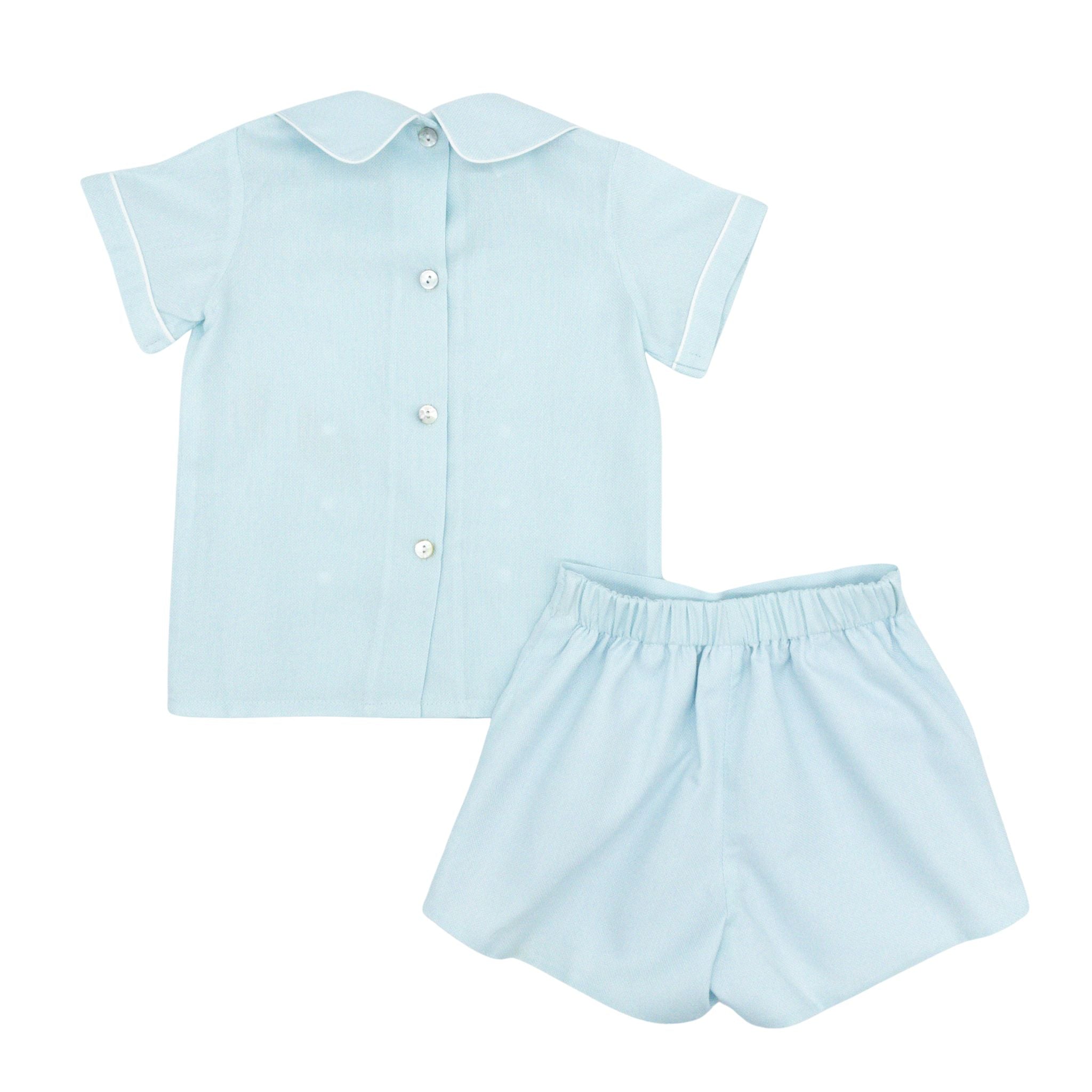 Say hello to effortless style! This mint short set combines a sharp collared shirt with front pleats and white dot embroidery scattered across the front. Back buttons on the shirt make dressing a breeze! Soft elastic-waist shorts complete the ensemble with comfort that keeps up with active kids. Whether it's Easter egg hunts, church services, family photo ops, or any special occasion, this set delivers sophistication with a fun, playful spirit. Your little guy will look absolutely dashing!