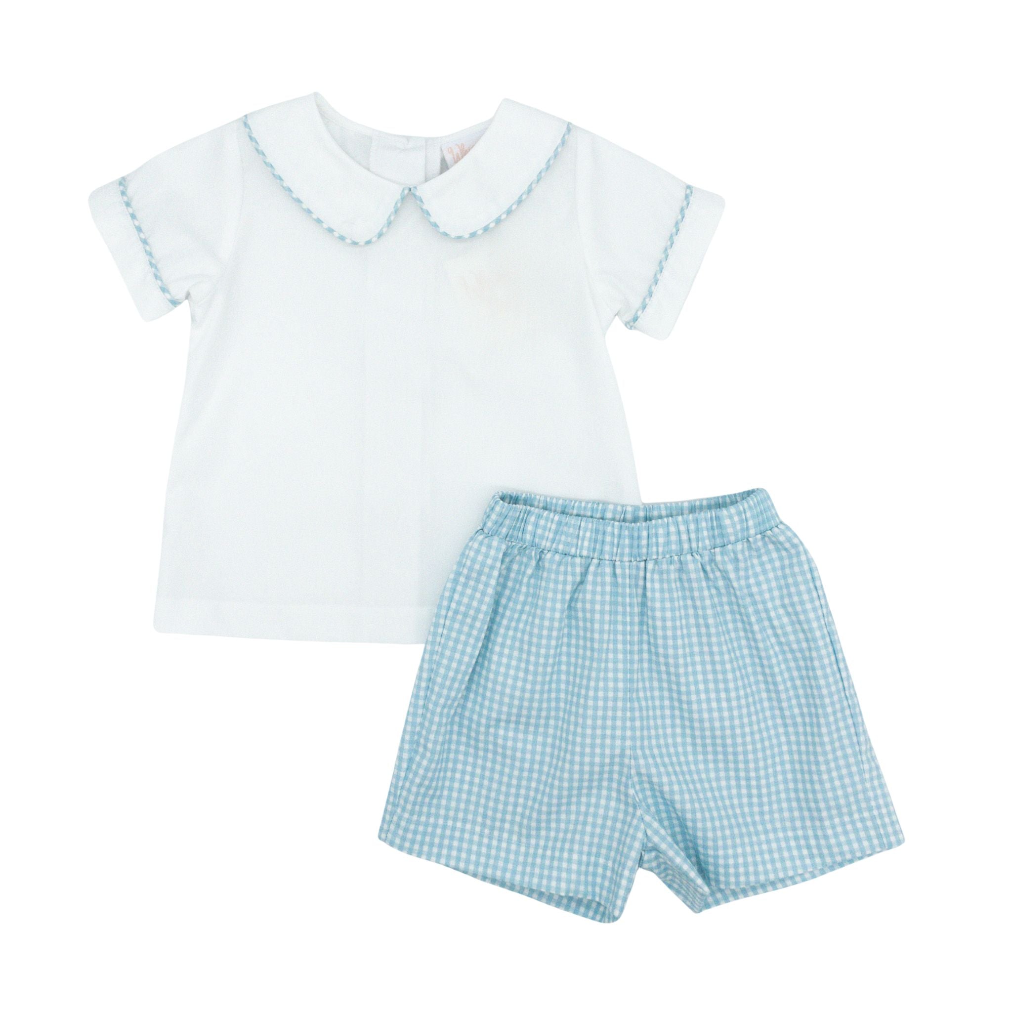 This charming boys' collared short set features a classic blue and white gingham pattern that's perfect for Easter celebrations, spring gatherings, or any special occasion. The crisp white collared shirt adds a polished touch that works beautifully for both fancier events and casual outings. This set provides comfortable, playful styling that kids love to wear. Ideal for creating memorable photos and keeping your little one looking dapper all season long.