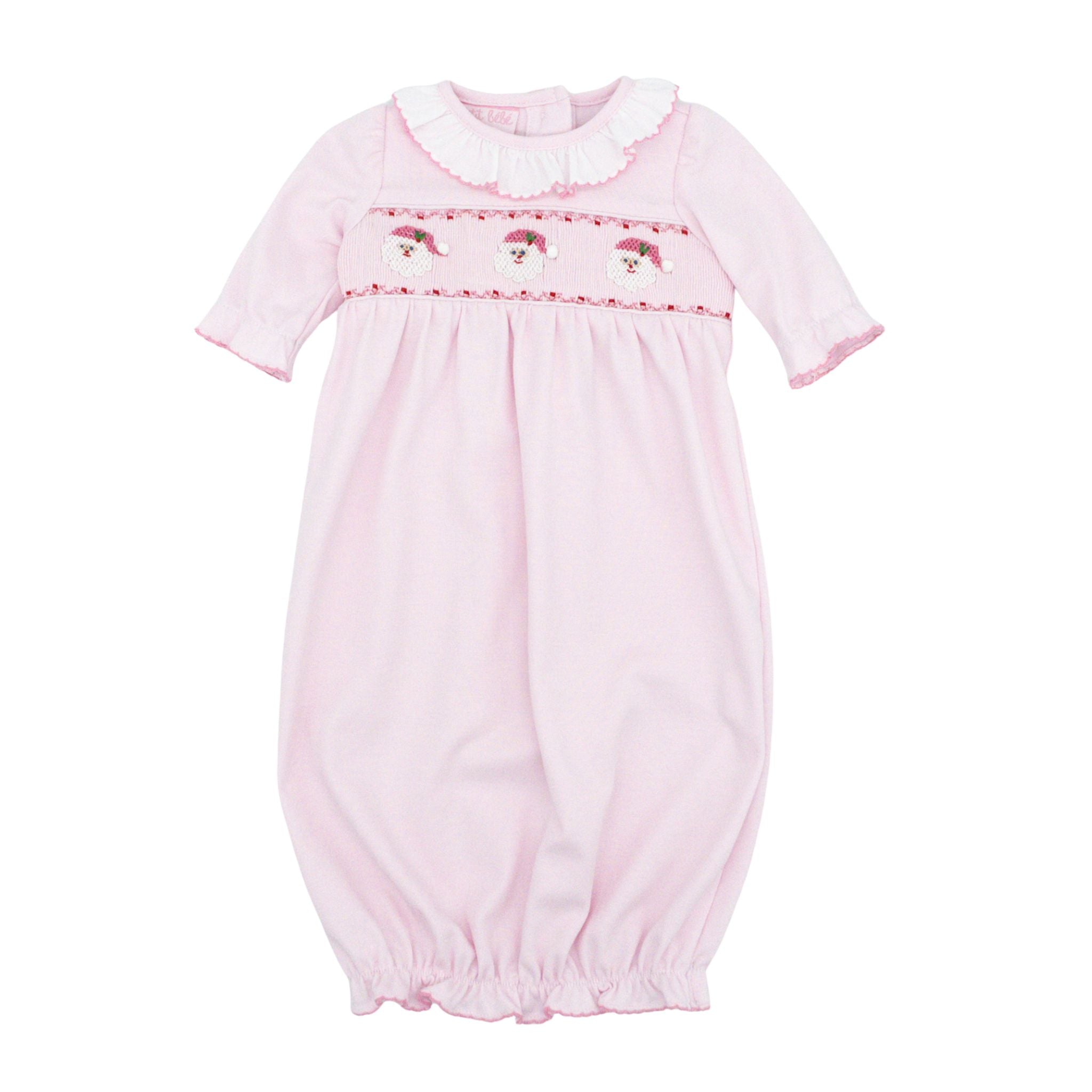 Bring festive cheer to your girl's collection with this Knit Sack with Hand-smocking by Petit Bebe! Adorned with hand-smocked Santa faces crafted on wonderfully soft knit material, it combines comfort and holiday spirit in one irresistible package!