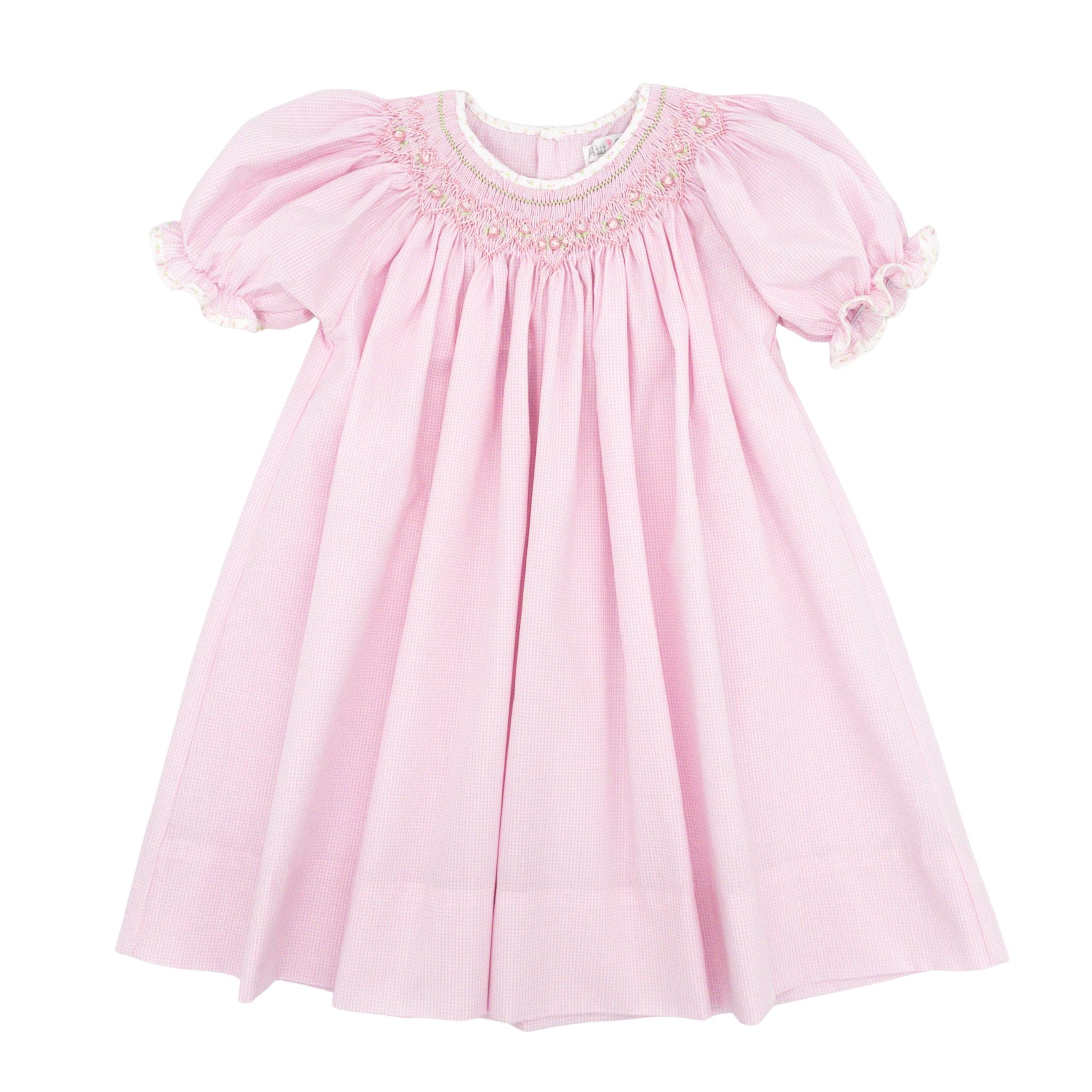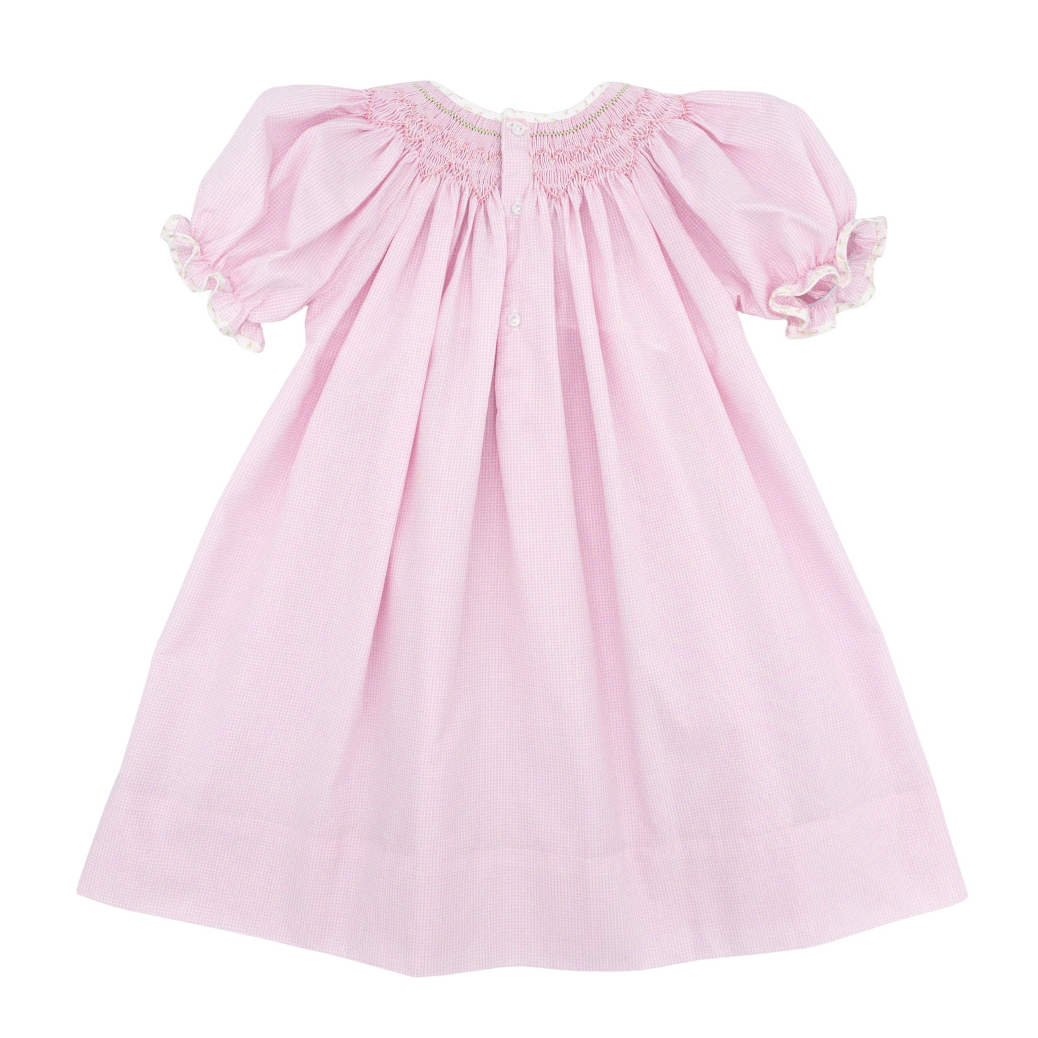 Celebrate the season ahead in this whimsical bishop dress bursting with springtime spirit. The cheerful pink gingham base pairs beautifully with floral prints gracing the neckline and sleeve hems, while smocked detailing showcases delicate embroidered flowers throughout. A precious smocked heart design takes center stage—making this dress an absolute showstopper for Valentine's Day or those first sunny days of spring. Playful, pretty, and perfect for kids who love making a statement.