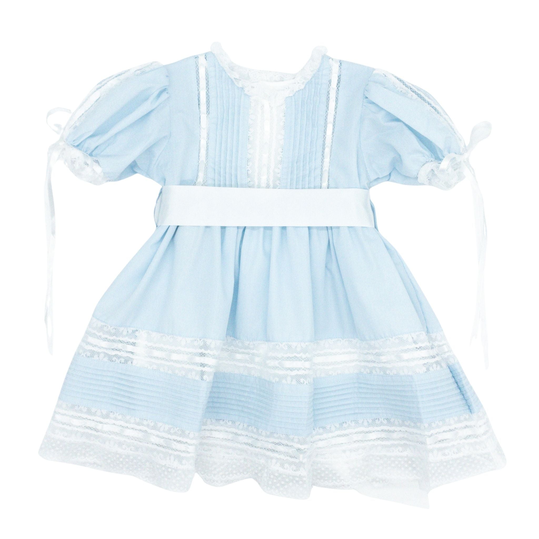 The River Heirloom Dress showcases a timeless design, highlighted by classic pintuck detailing. Adorned with elegant white lace and a delicate satin ribbon, this dress exudes refined charm. It is perfect for portraits, first communions, church ceremonies, and other special occasions, offering a sophisticated look that gracefully honors tradition.