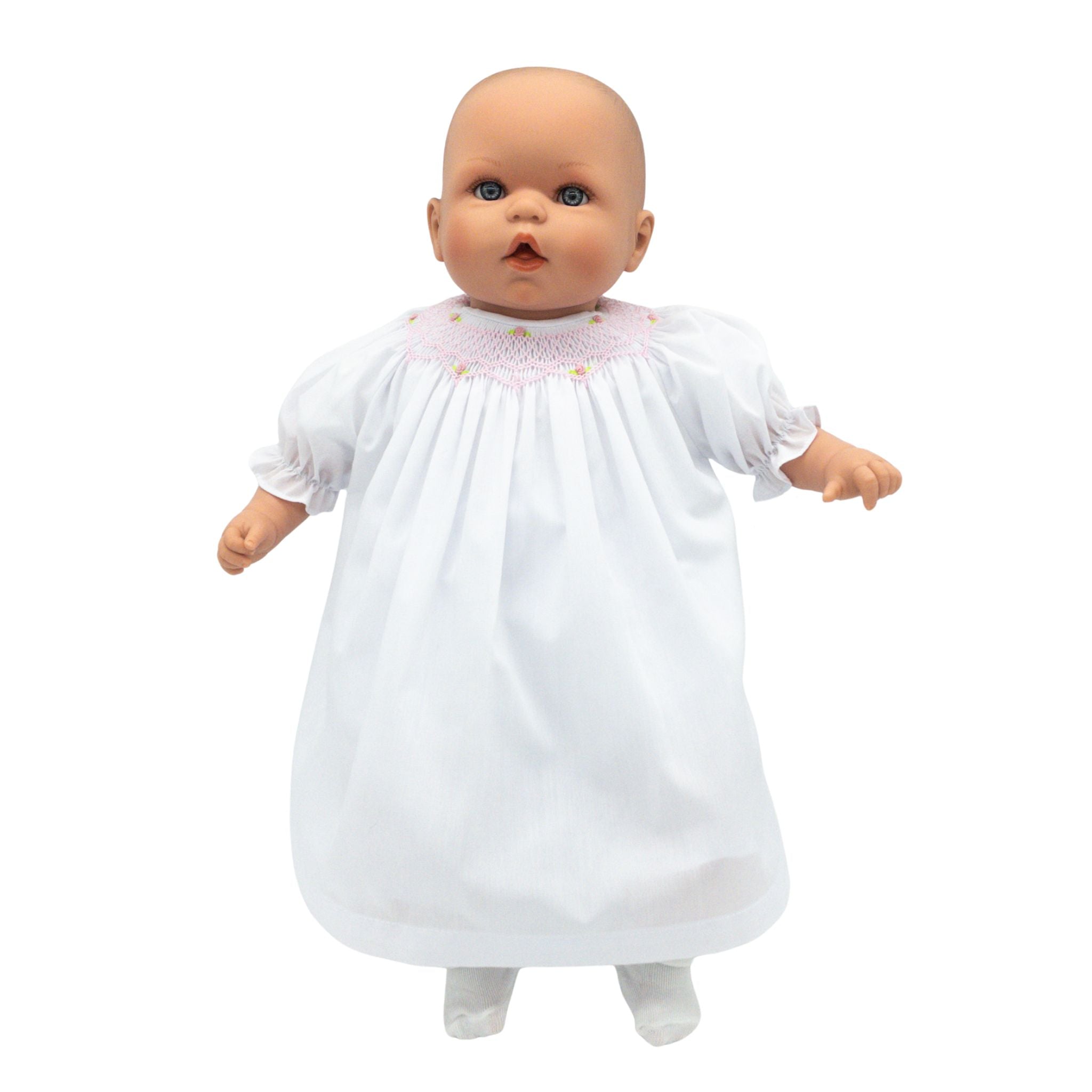 Fulfill your little one's passion for dolls with the Ruby Doll. This classic baby doll has a happy and sweet facial expression. She is dressed in a beautiful, hand-smocked bishop dress, complete with bloomers and socks. The soft body design makes her perfect for cuddling and imaginative play.
