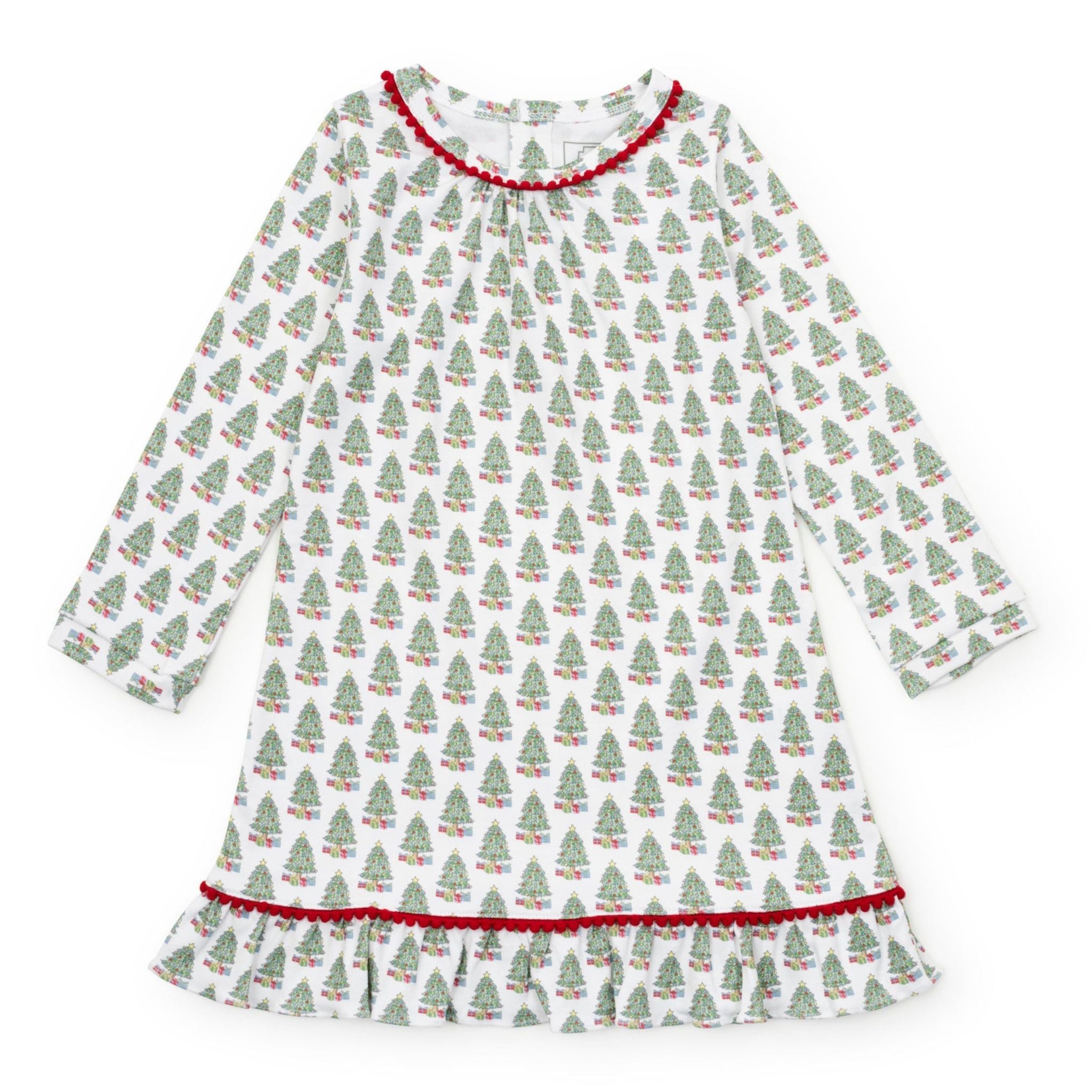 This Carlin Gown adds festive flair to your holiday wardrobe! Crafted from luxurious Peruvian Pima cotton, it showcases a playful Christmas tree print and fun pom pom trim. Matching sibling outfits are also available!