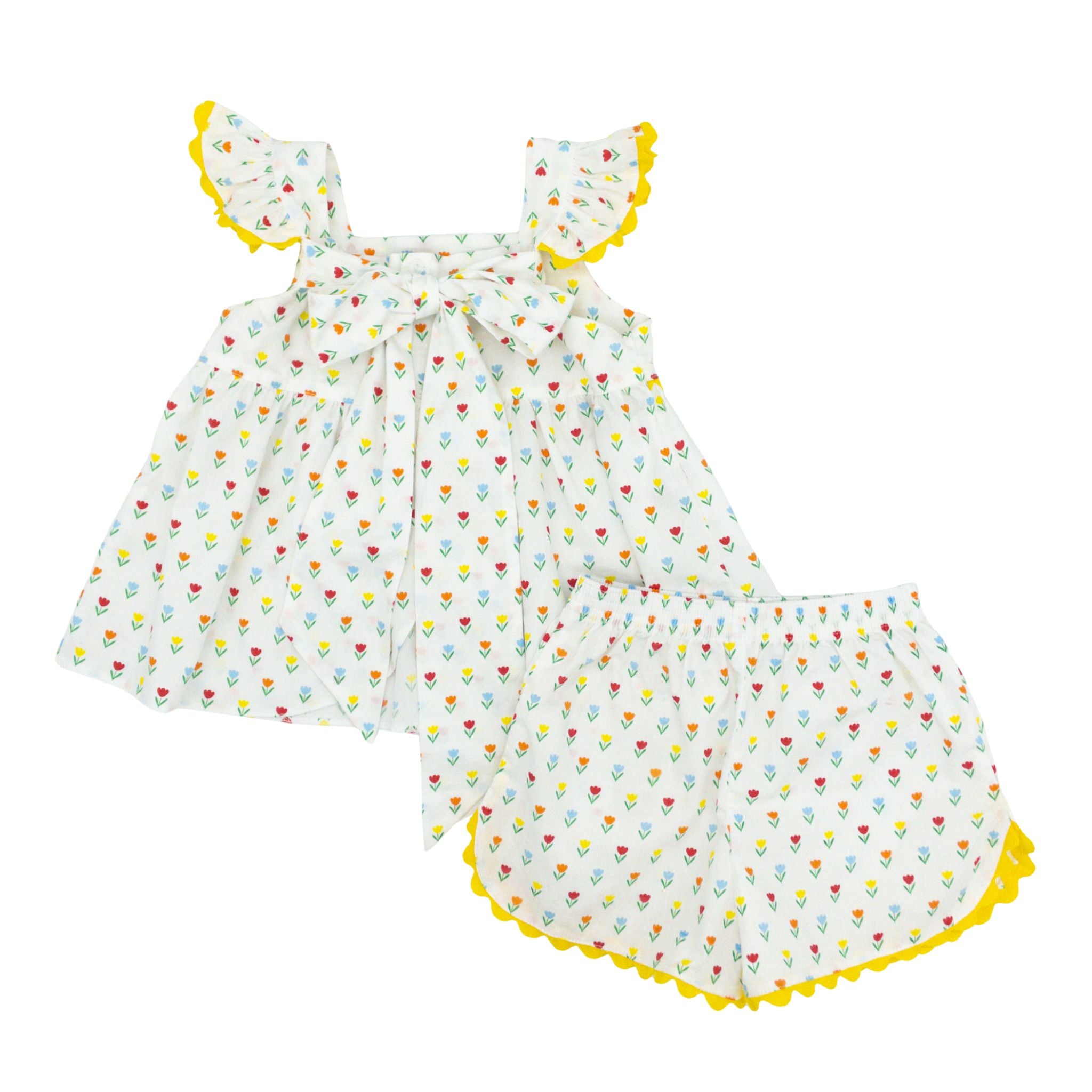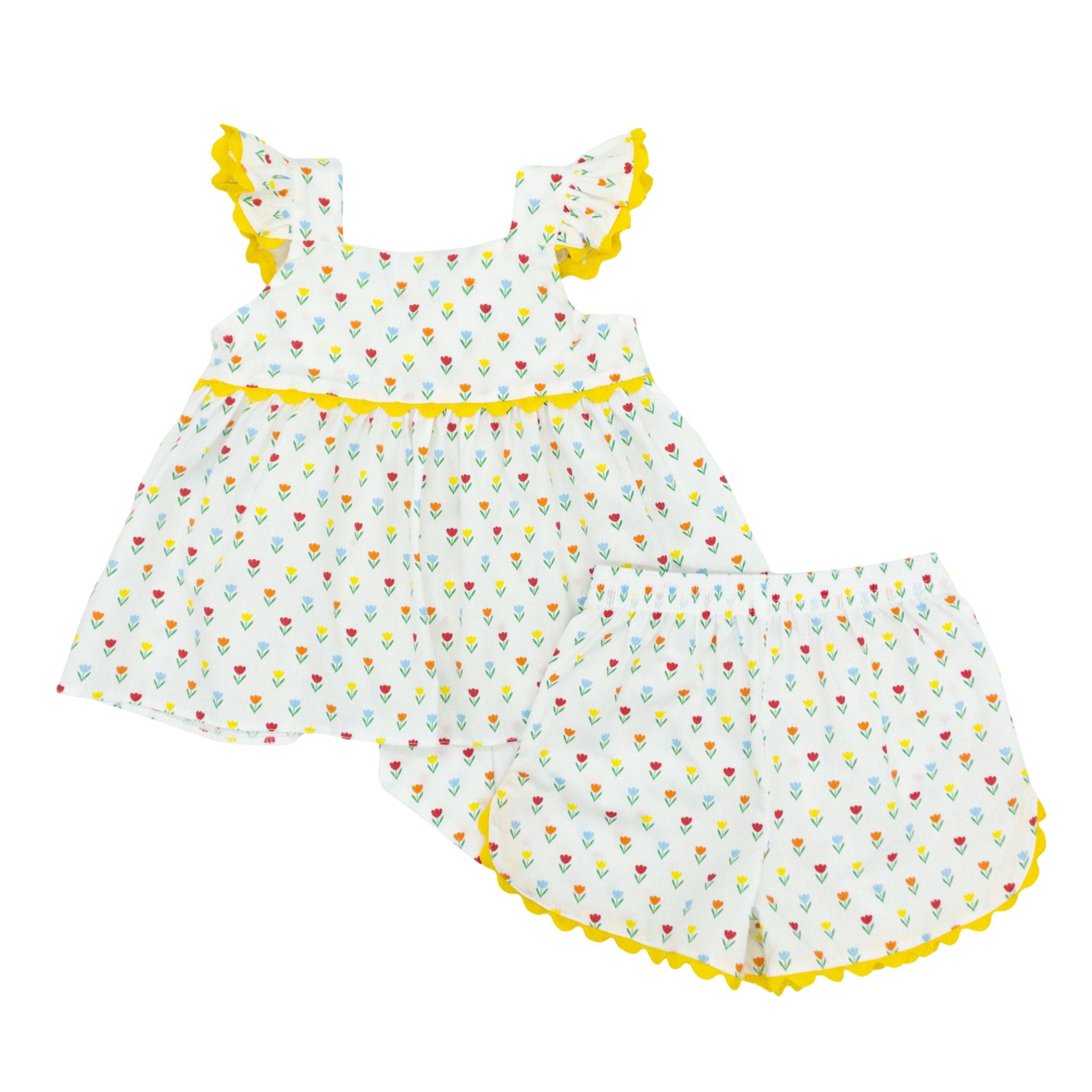 Meet your little one's new spring must-have! The Clementine Short Set bursts with vibrant tulips that celebrate the season in the most delightful way. Trimmed with cheerful yellow ric rac, this playful outfit strikes the perfect balance between cute and comfy. From backyard playdates to family outings, she'll love reaching for this versatile set again and again. It's the kind of piece that makes getting dressed fun!