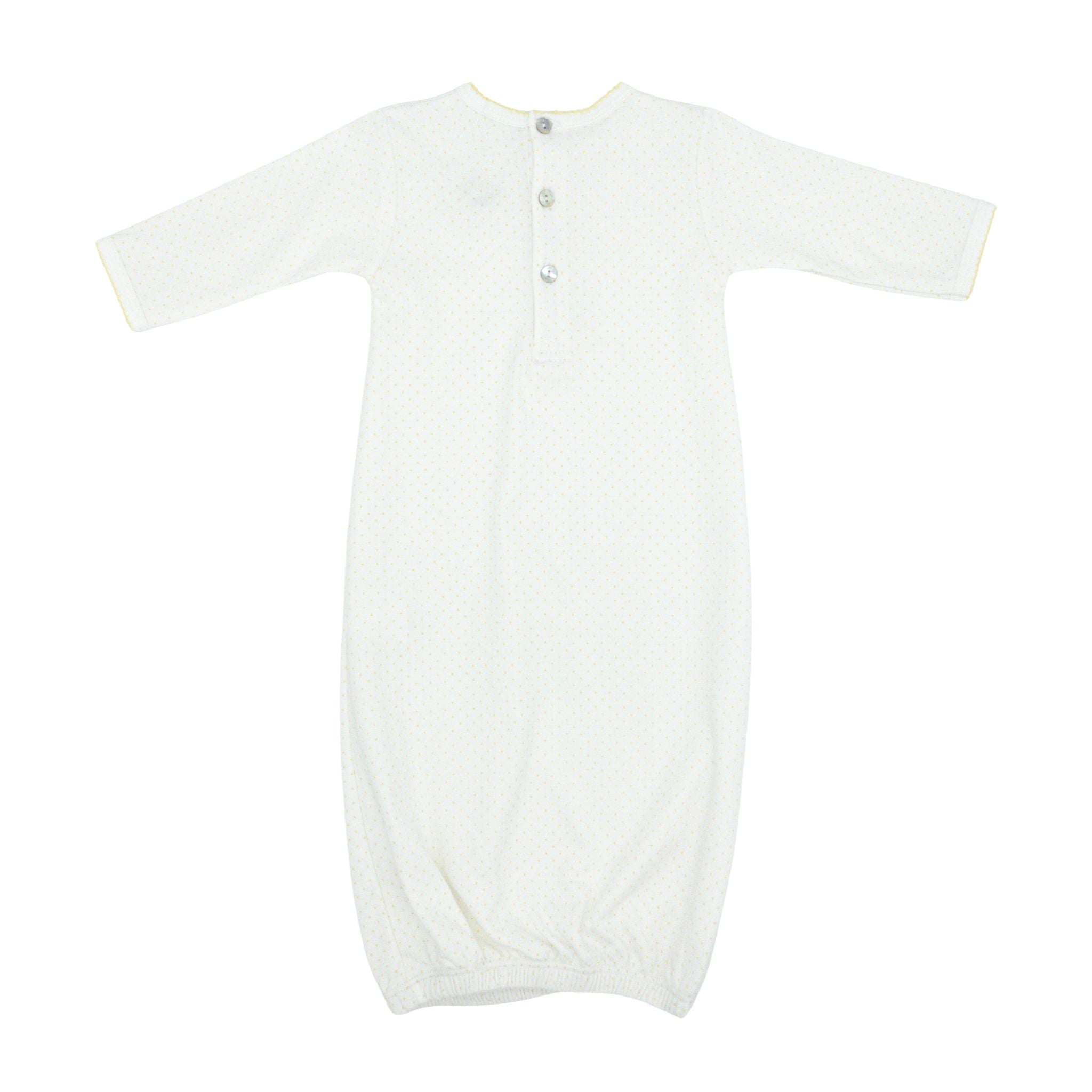 Say hello to the cutest addition to baby's closet! This delightful daygown features an adorable crocheted giraffe perched on the front, complemented by a cheerful yellow pindot design. Sewn from premium 100% Pima Cotton, it's incredibly soft and breathable for all-day comfort. Practical back buttons allow for hassle-free changes, while the elasticized hem adjusts as your baby grows. Pure joy wrapped in cozy fabric!