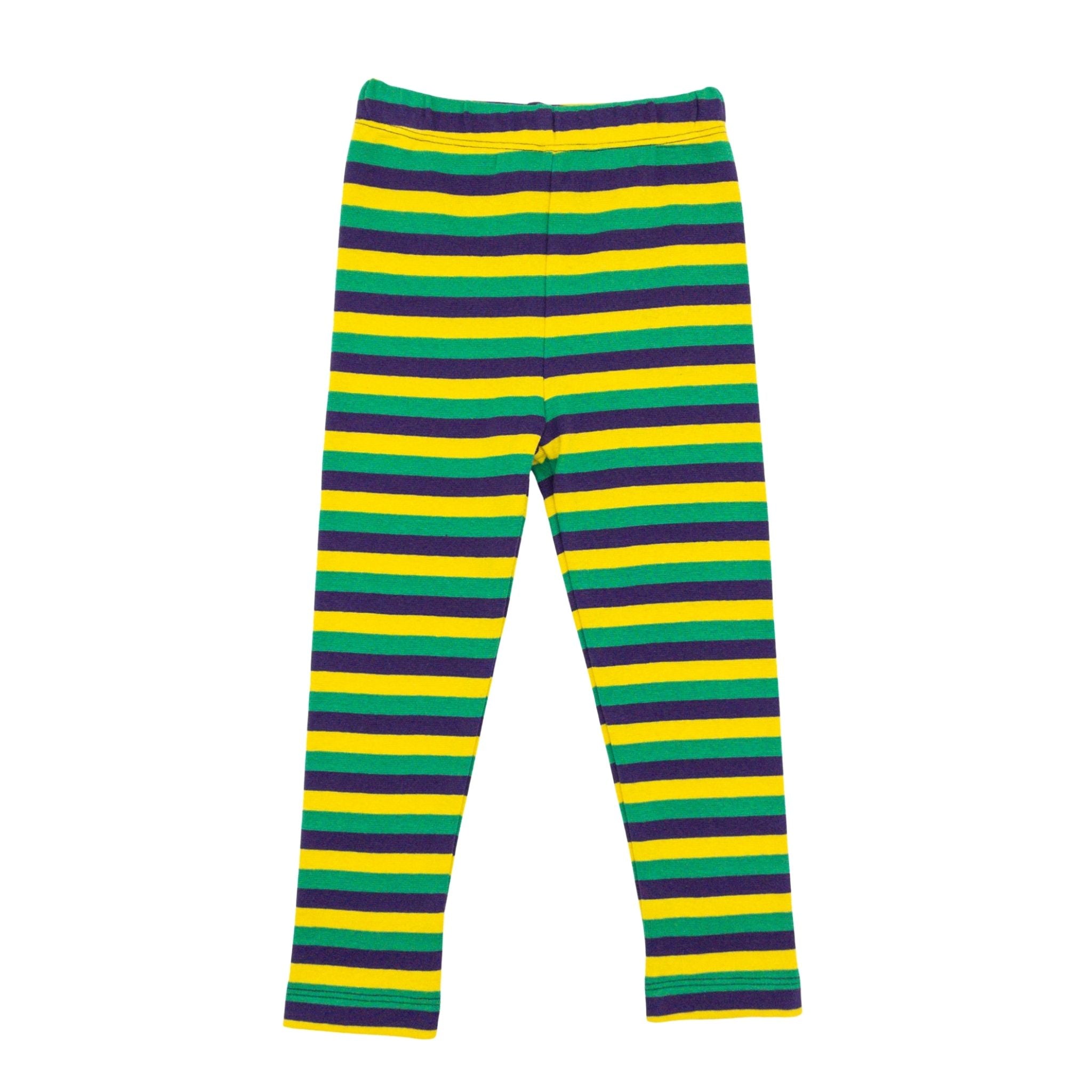 Get ready to celebrate in style with these vibrant Striped Straight Leggings! Featuring bold purple, green, and gold stripes inspired by classic Mardi Gras colors, these comfy leggings are perfect for parade season. Pair them with our matching Mardi Gras Pom Pom Sweater for a complete party-ready look that'll have everyone cheering!