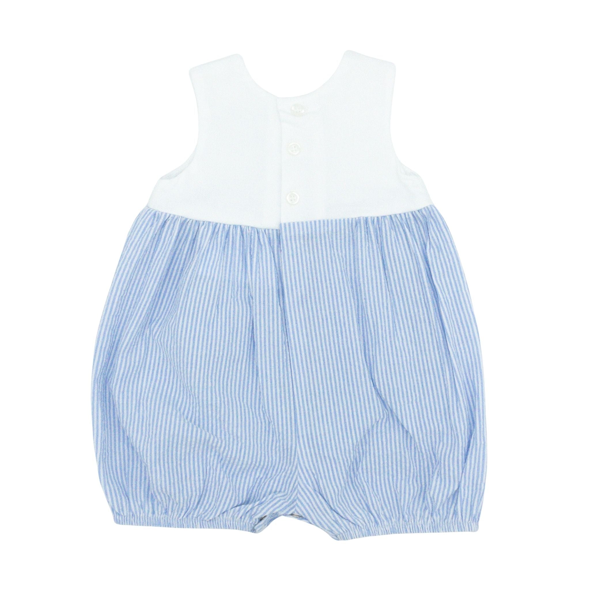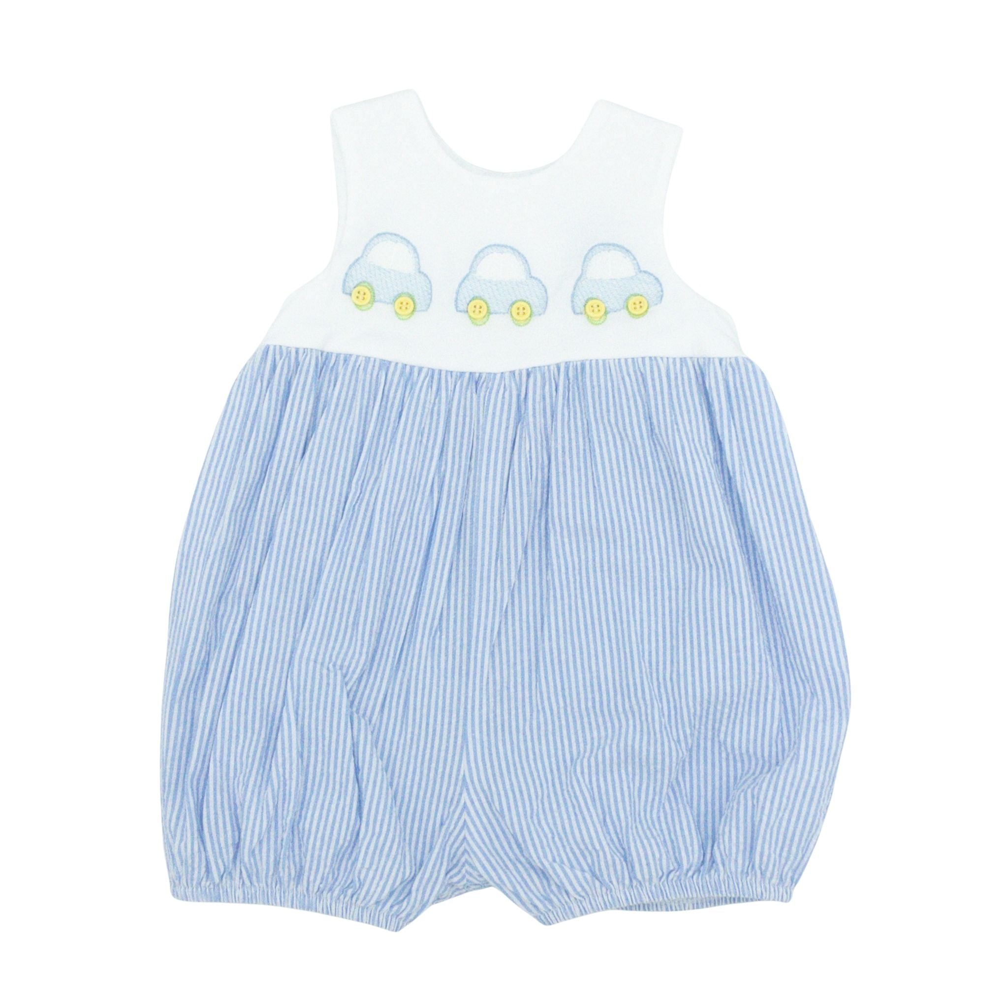 Vroom, vroom! This delightful sunbubble brings playful style to warm days with adorable embroidered car motifs on the chest. Dressed in soft blue seersucker fabric that's as breathable as it is charming, it's made for little ones learning to move! Stride snaps make quick work of diaper duty, so you can get back to the fun faster. A must-have for any tiny traveler's summer wardrobe!