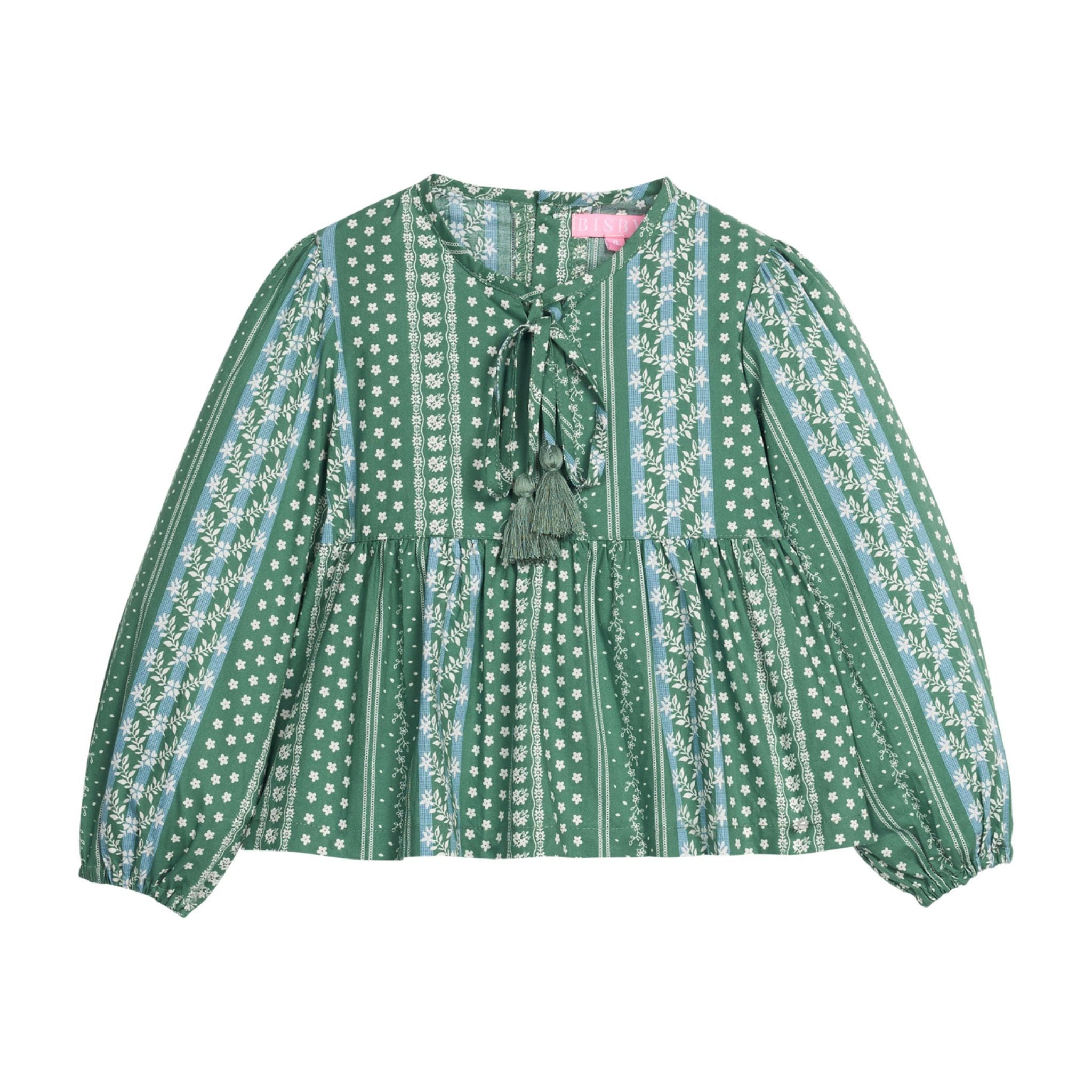 The Riviera Top in Fairfield Forest Stripe from BISBY by Little English is a stylish addition to any wardrobe. Made with a beautiful woven fabric and featuring eye-catching floral designs, this top is certain to attract attention.
