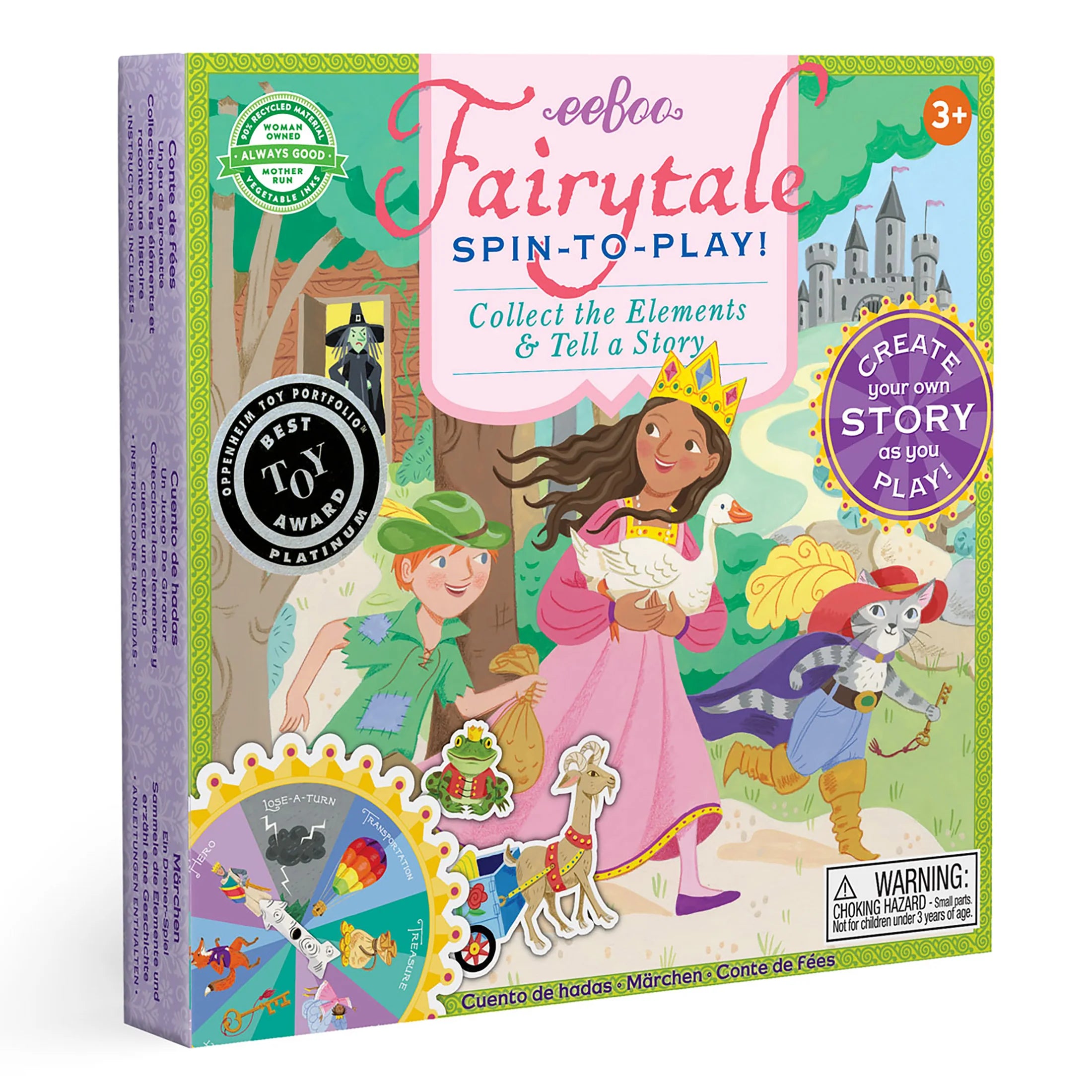 eeBoo's award-winning Fairytale Spin-to-Play Game will take you to a faraway land! Players spin to select the elements for their fairy tale. When they have collected a scene, a hero, a magical helper, a rival, a magical object, transportation, and a treasure, they tell the tale that these elements evoke. Game extensions encourage compassion by suggesting using a misunderstood rival as a hero on occasion, and longer tales for two players. Illustrated by Lizzy Rockwell. Winner of Oppenheim Platinum Best Toy Award.