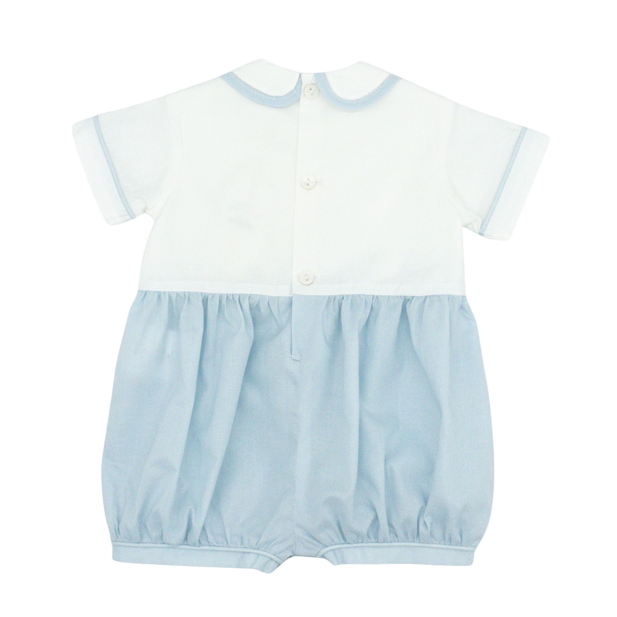 Say hello to the Sundays Best Bubble in Blue Batiste—a delightful outfit that's ready for anything! Crafted from soft antique white and blue batiste, this bubble style features precious embroidered details scattered across the waist with charming button flourishes. The blue-trimmed collar and sleeves add a refined touch. Perfect for church mornings, family pictures, or celebrating life's special moments, this outfit brings elegance and all-day comfort to your little guy's wardrobe!