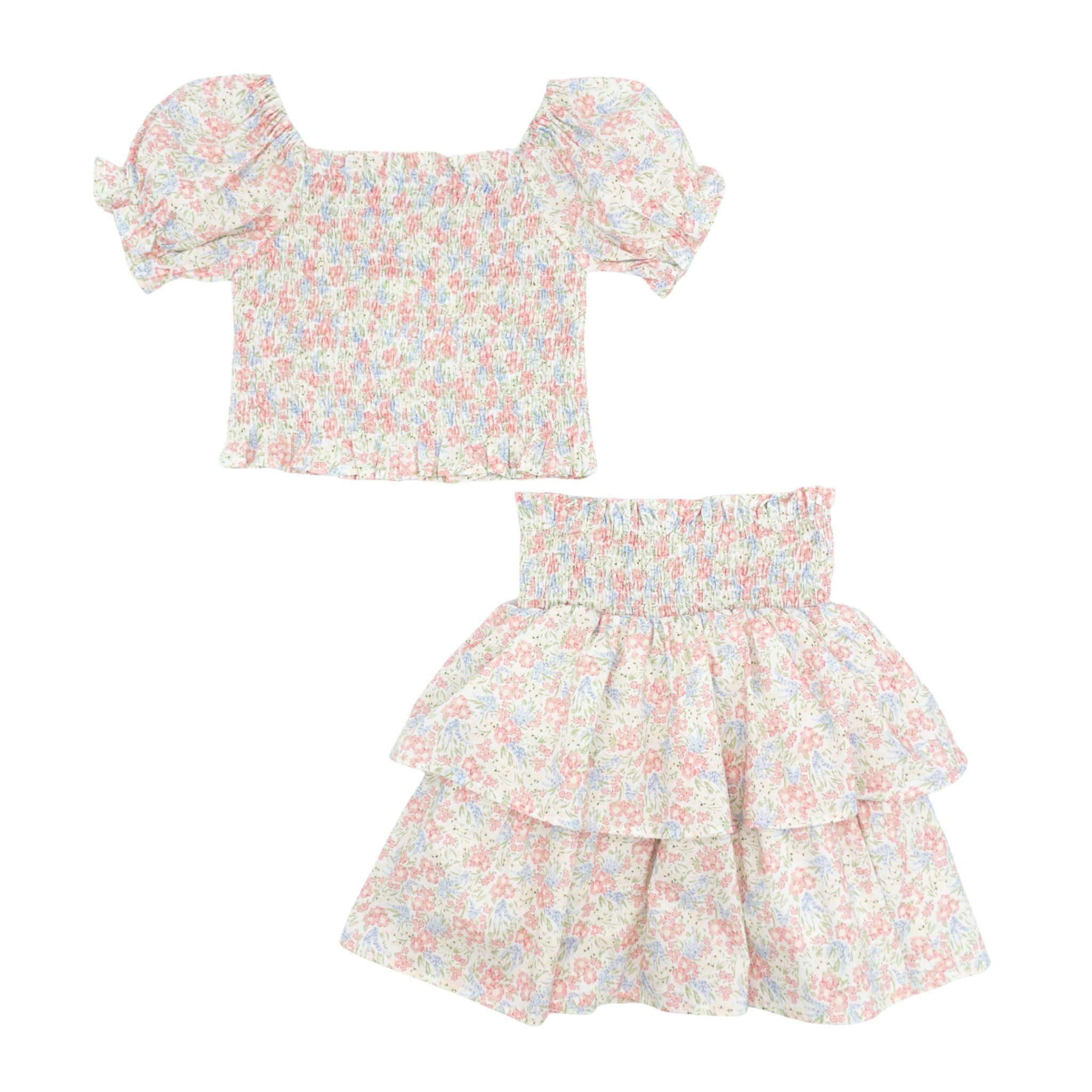 This Chloe Smocked Skirt Set in Floral pairs a beautifully smocked top with a matching smocked skirt, offering a comfortable fit for all-day wear. The dreamy floral print adds a great pop of color to her spring and summer wardrobe. Whether worn together or styled separately, this skirt set is a darling choice for playdates, outings, and special moments alike!