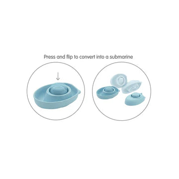 It's a rubber boat that explores both the surface and the underwater depths! By simply pressing the center of the hull and turning it over, the boat becomes a submarine. This makes for an extra unique play experience during bath time and water play. Challenge your child's creative thinking skills and stimulate their imagination while inviting them to explore their fine motor development with this water toy.