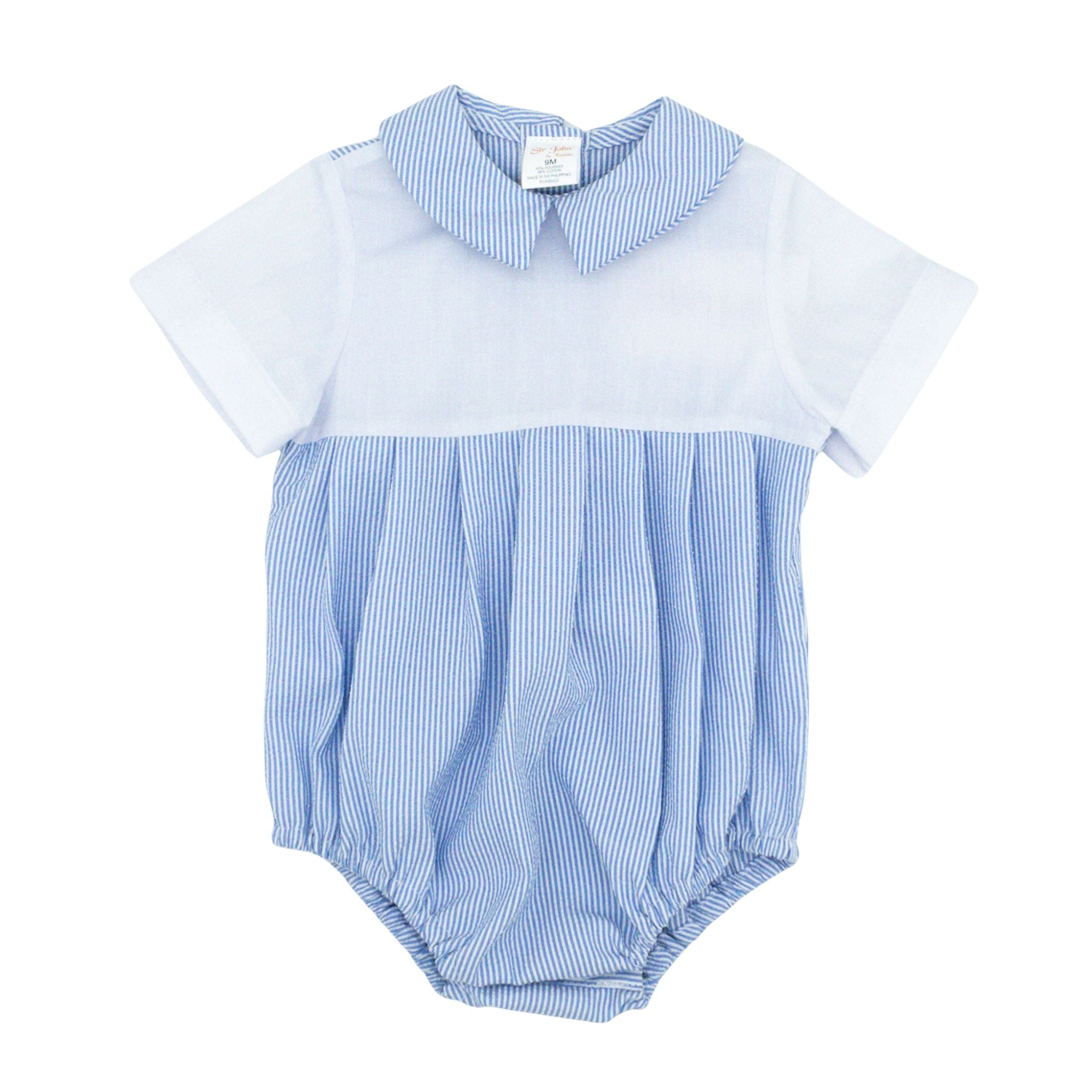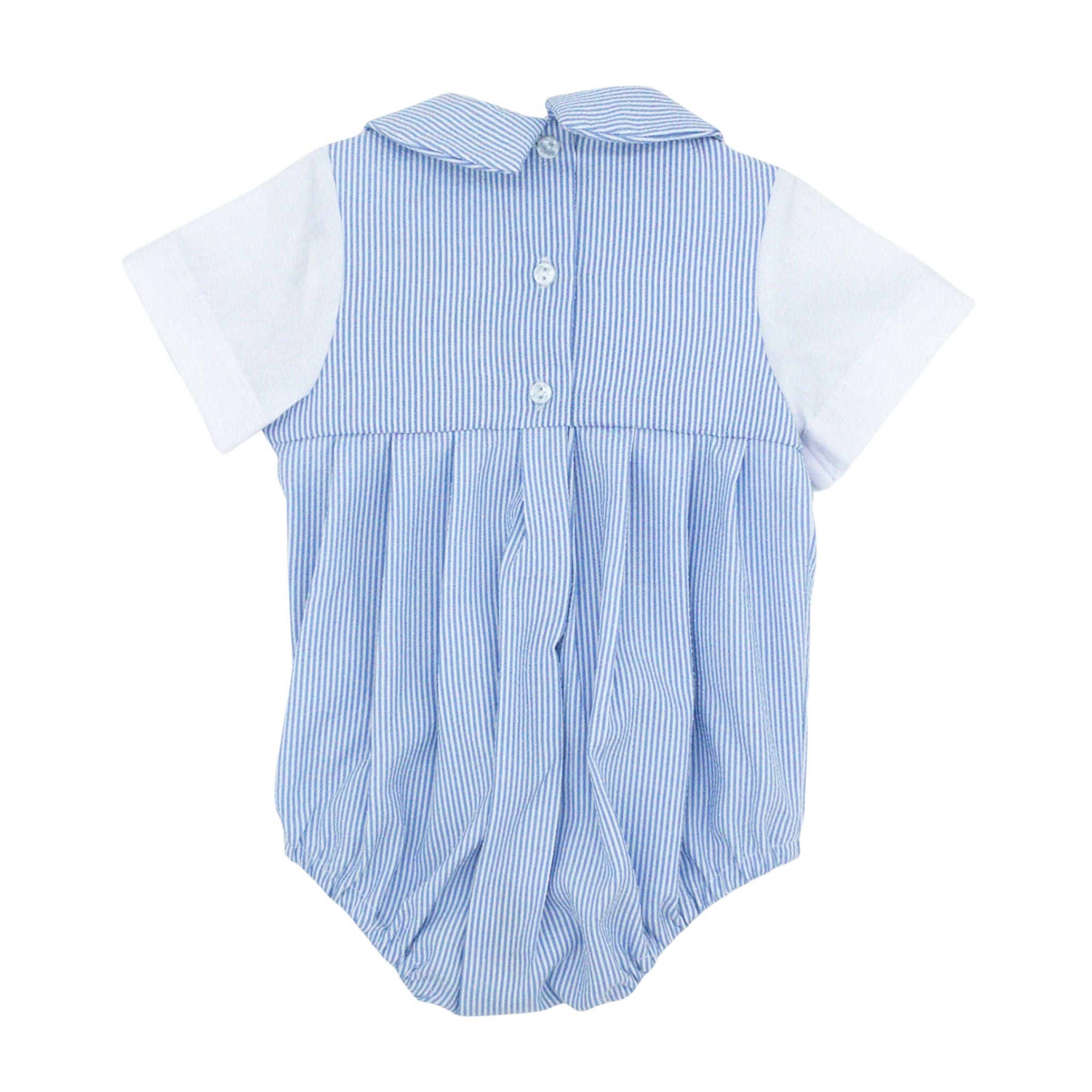 This charming bubble features a crisp white top and sleeves paired with a delightful blue and white seersucker collar and bodice. The pleated seersucker fabric adds texture and movement, creating a look that's both playful and polished. Perfect for special occasions or everyday adventures, this piece strikes the ideal balance between cute and sophisticated—giving your little guy a dapper, put-together style that parents love!