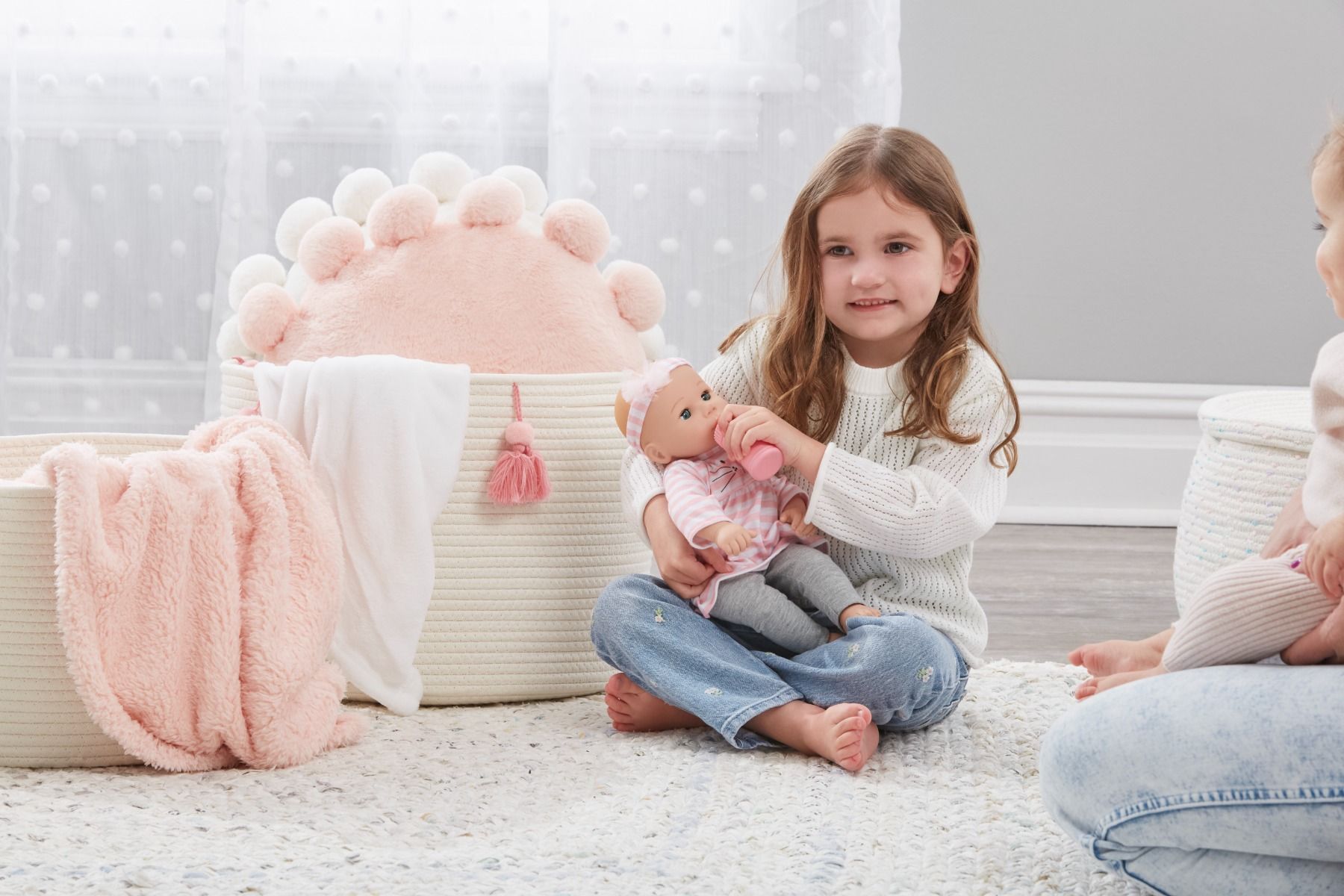 This adorable 14” baby is just the right size for your child to snuggle! The baby has a soft body, a weighted bottom and molded head, legs, and arms so it feels so real to your child! The baby’s gently smiling face has sleepy eyes, facilitating bedtime play. She comes dressed in an adorable kitty tee, polka dot leggings and matching headband with a bottle. Ages 12 mo+.