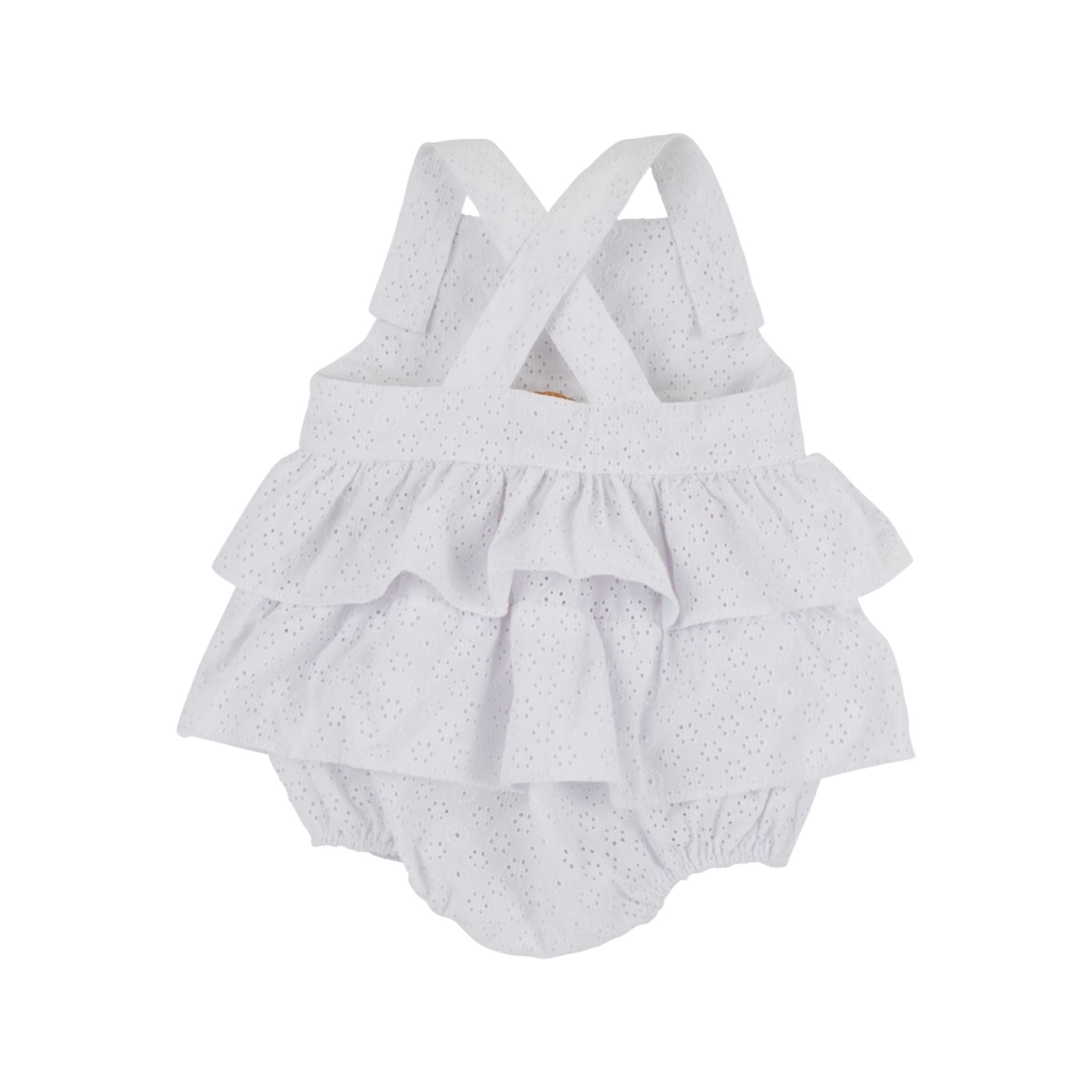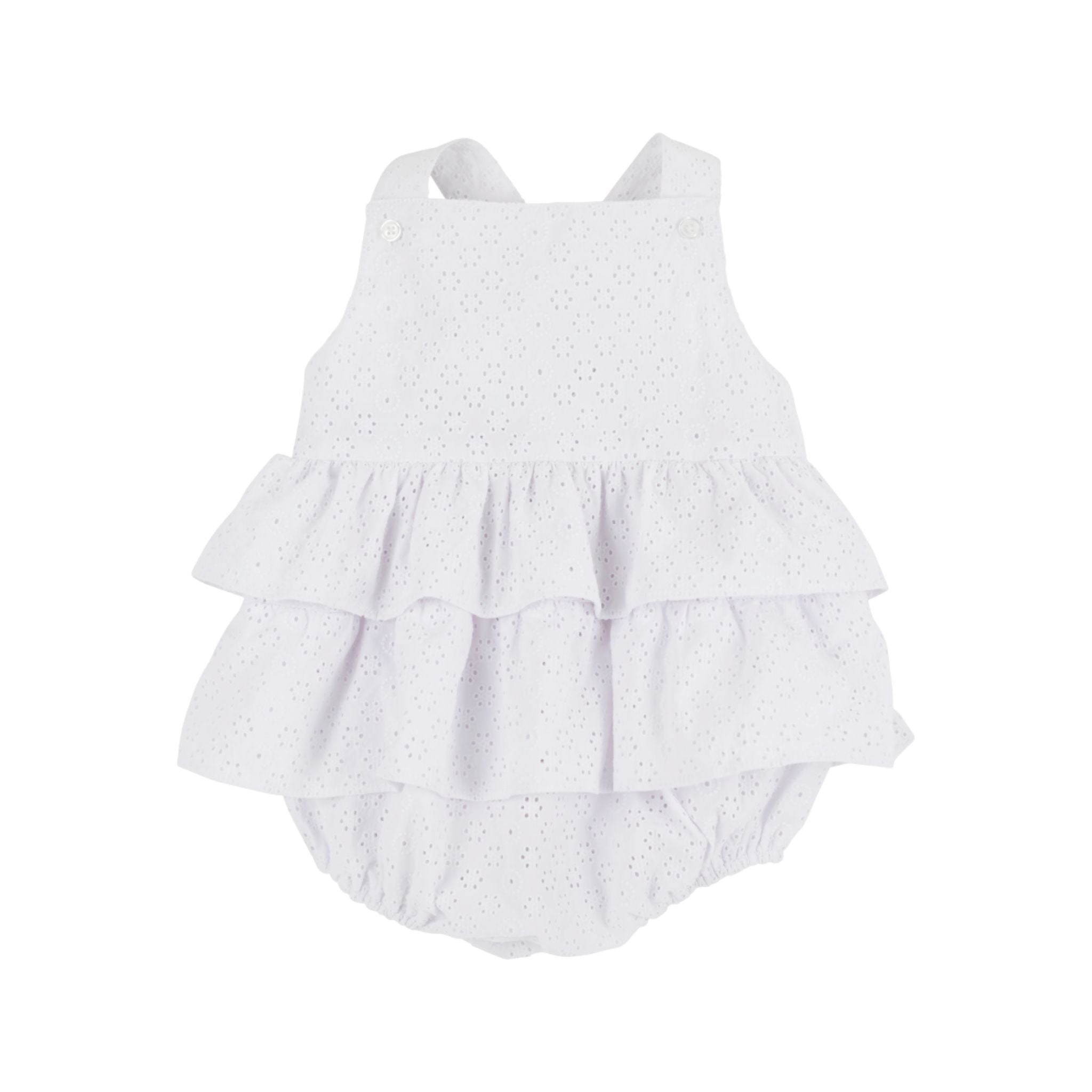 The Blakely Bubble in Worth Avenue White Eyelet is a timeless one-piece that combines charm with everyday comfort. Crafted from delicate white eyelet fabric, this classic bubble features a sweet silhouette perfect for special occasions or sunny days at play.