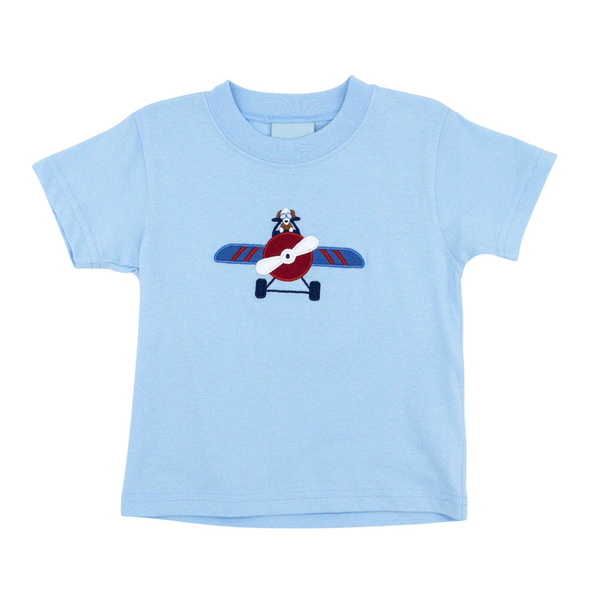 Get ready for takeoff with this vibrant blue t-shirt that features an appliqué of a fearless dog piloting an airplane! Perfect for boys with big imaginations, this playful design celebrates adventure and animal antics in one charming package. Soft and comfortable for all-day wear, it's an instant wardrobe favorite!