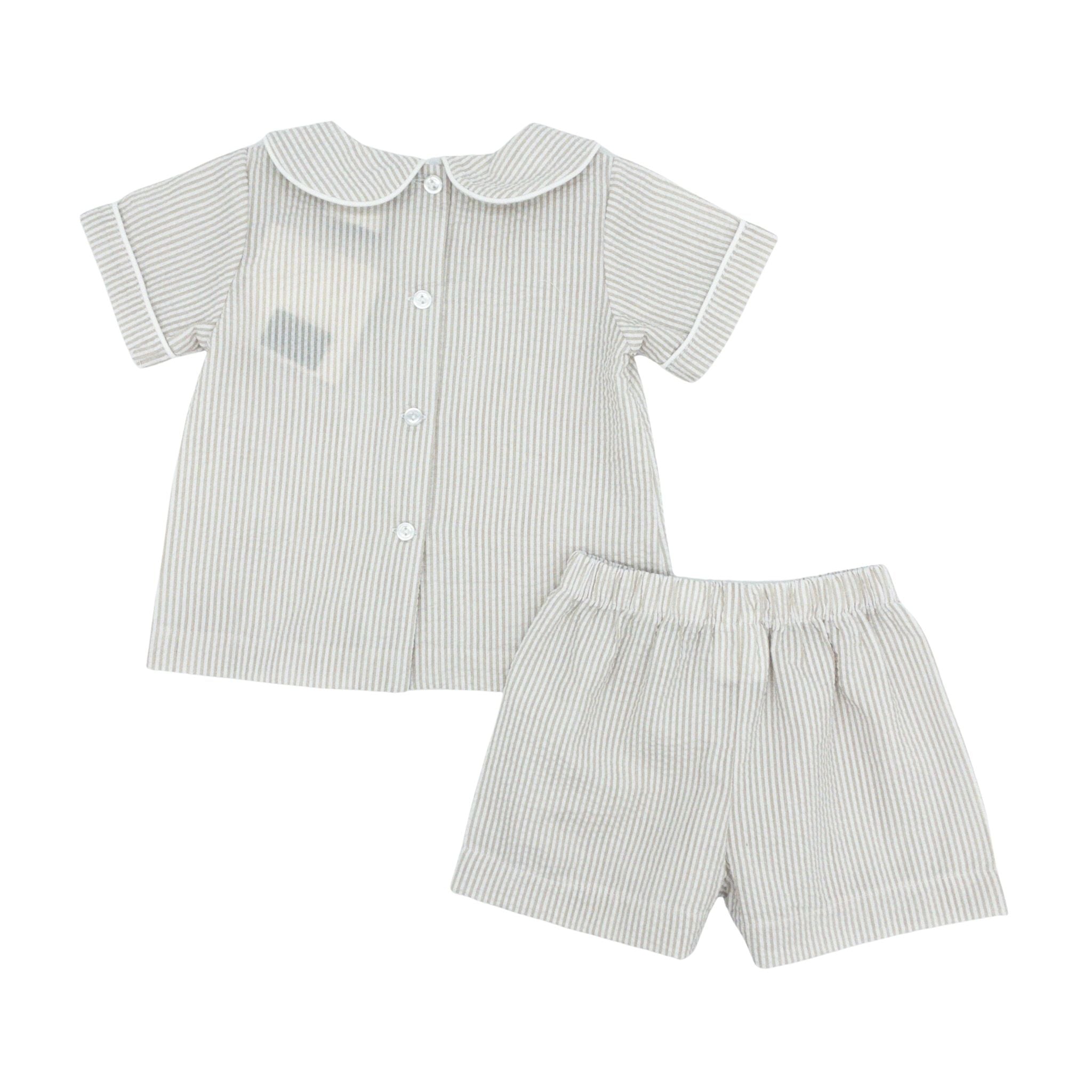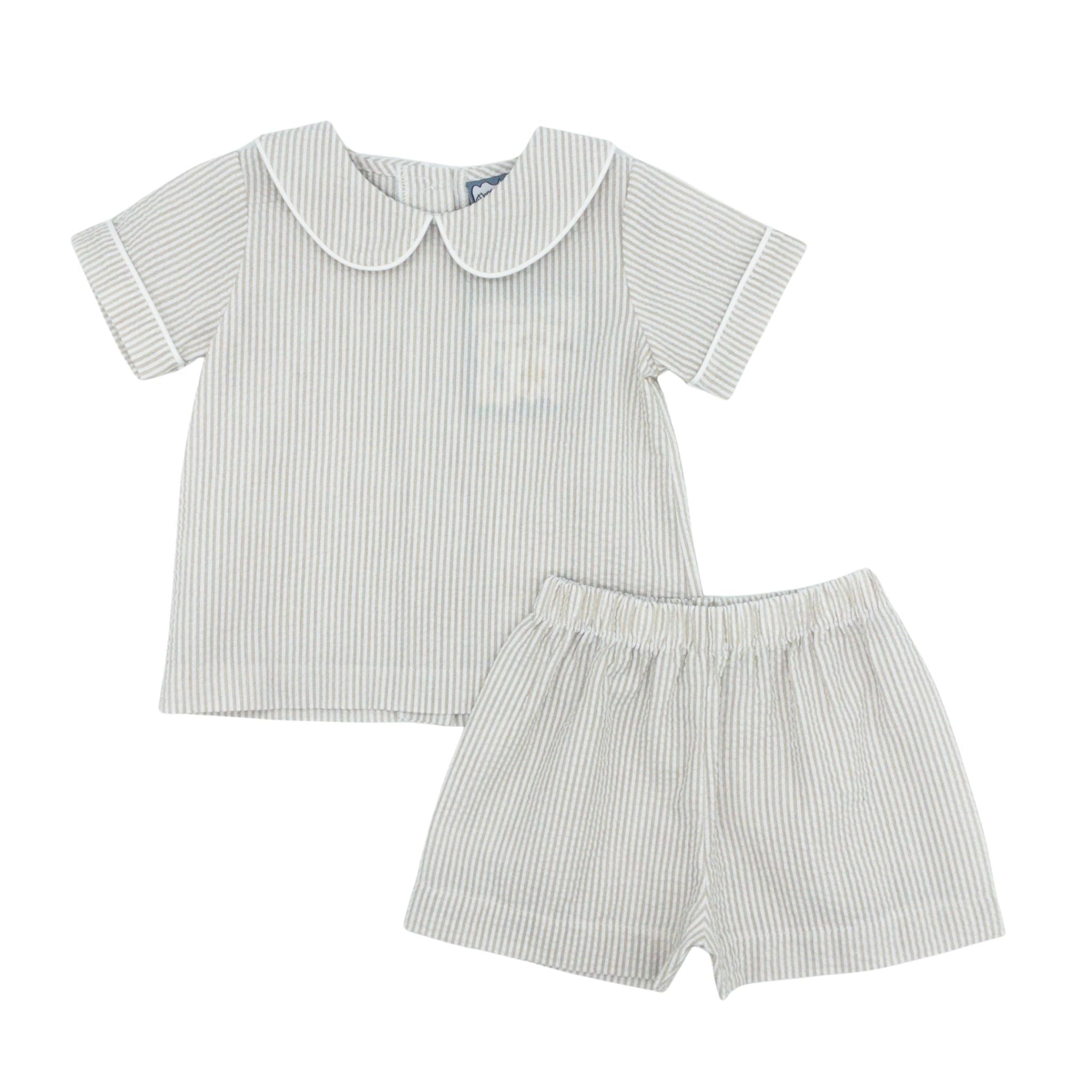 Dress your little one in timeless style with this khaki striped seersucker short set. The lightweight, breathable fabric keeps him comfortable during warm weather while maintaining a polished look perfect for church, family photos, or vacation. Classic seersucker construction offers both durability and that effortless spring aesthetic every parent loves.