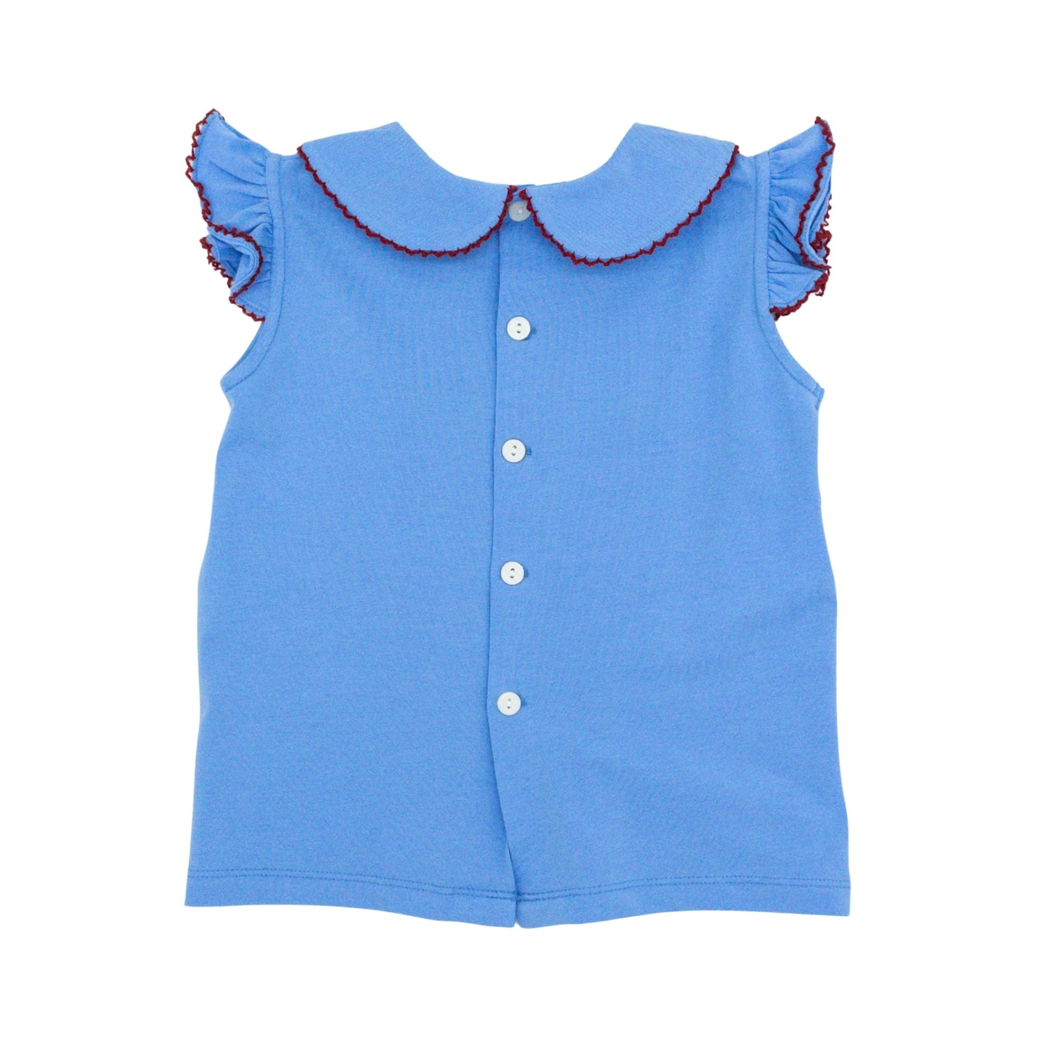Celebrate patriotic spirit in this charming Emma Shirt, crafted from soft chambray knit fabric. Features a classic Peter Pan collar and graceful angel sleeves trimmed with delicate red picot edging. The front showcases vibrant hand-embroidered details in red, white, and blue—a cheerful bow, American flag, and festive fireworks. Perfect for Independence Day gatherings, summer celebrations, or any occasion calling for patriotic flair. A fun and festive piece that brings timeless style with a contemporary twist.