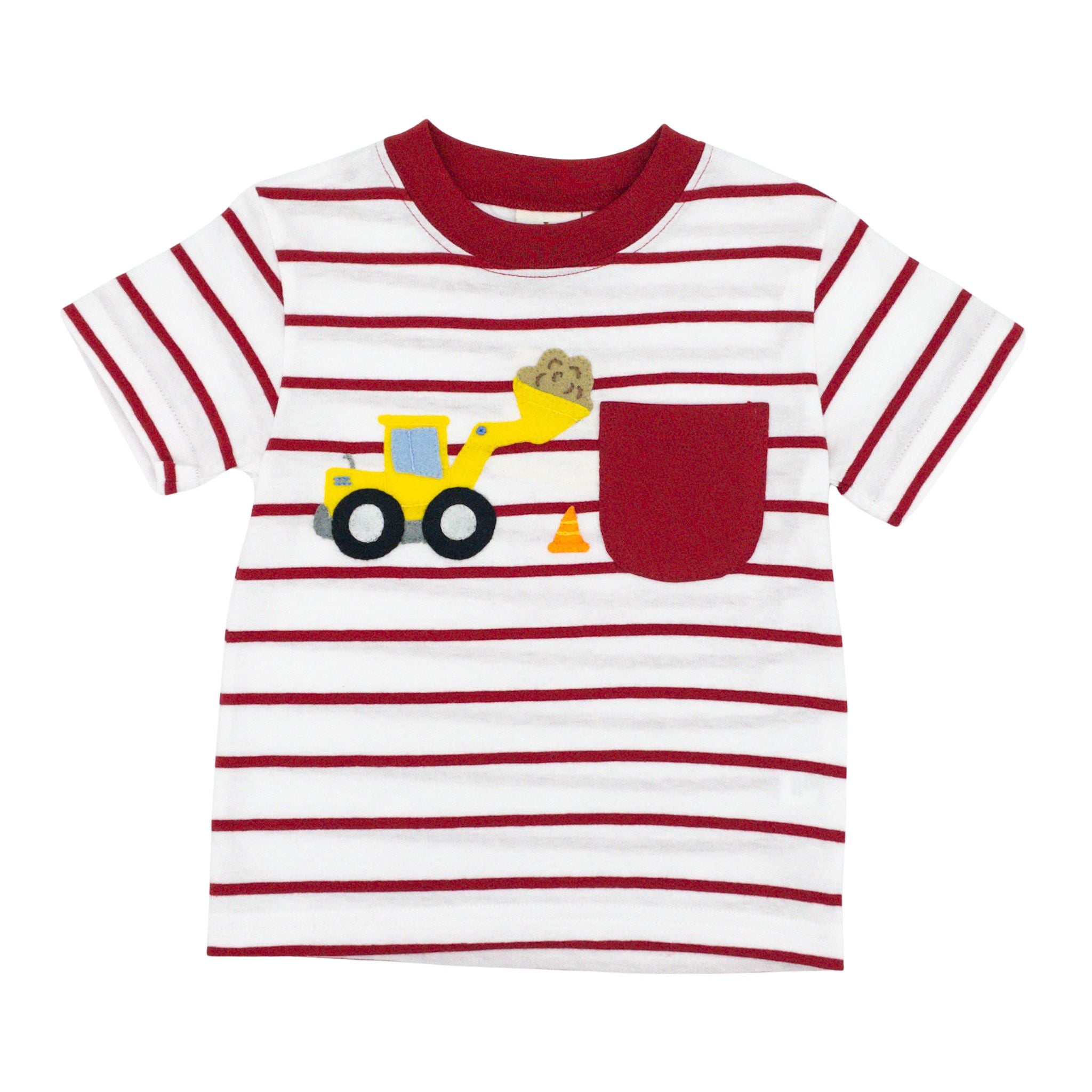 This adorable tee brings construction fun to everyday wear! Featuring a charming felt front loader applique on the chest, it's perfect for little builders. The classic red and white striped design pairs beautifully with a matching red ringer neckline and functional pocket detail. Soft, comfortable, and bursting with personality!