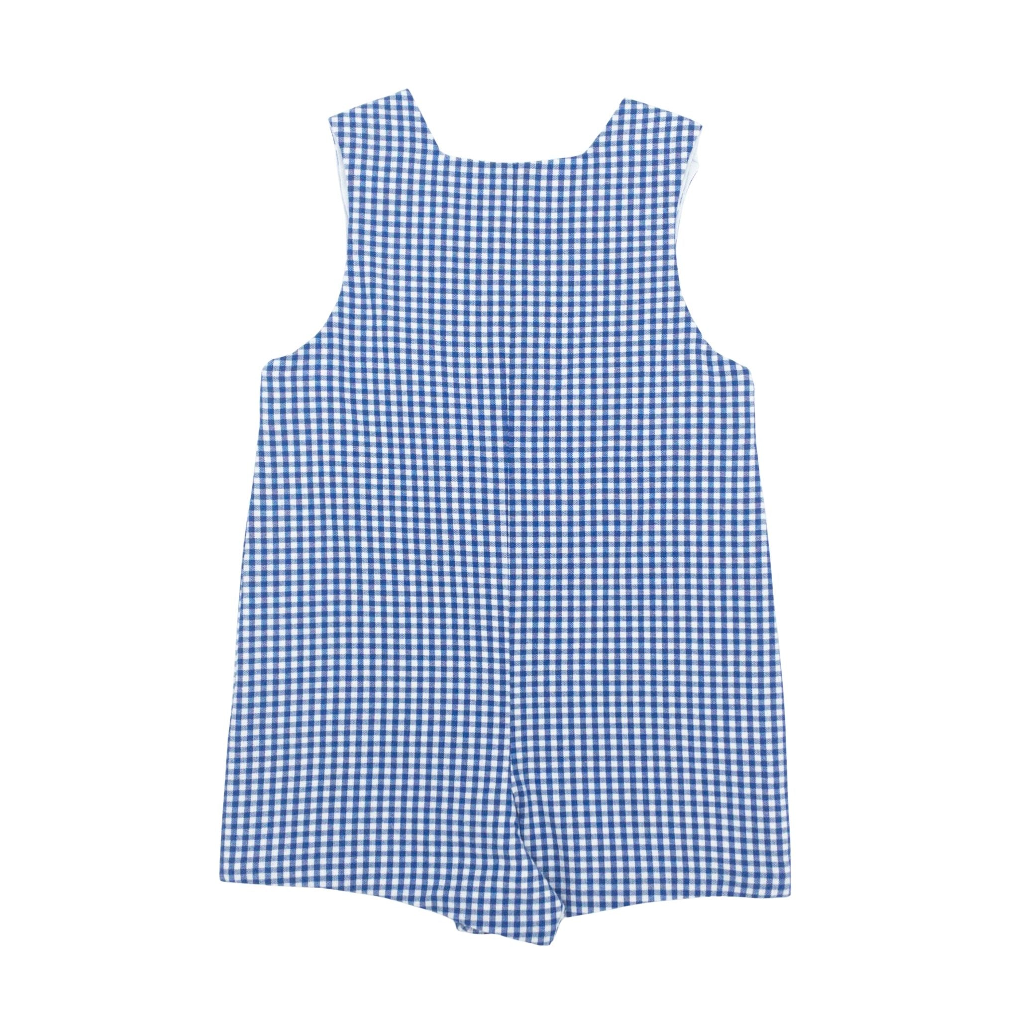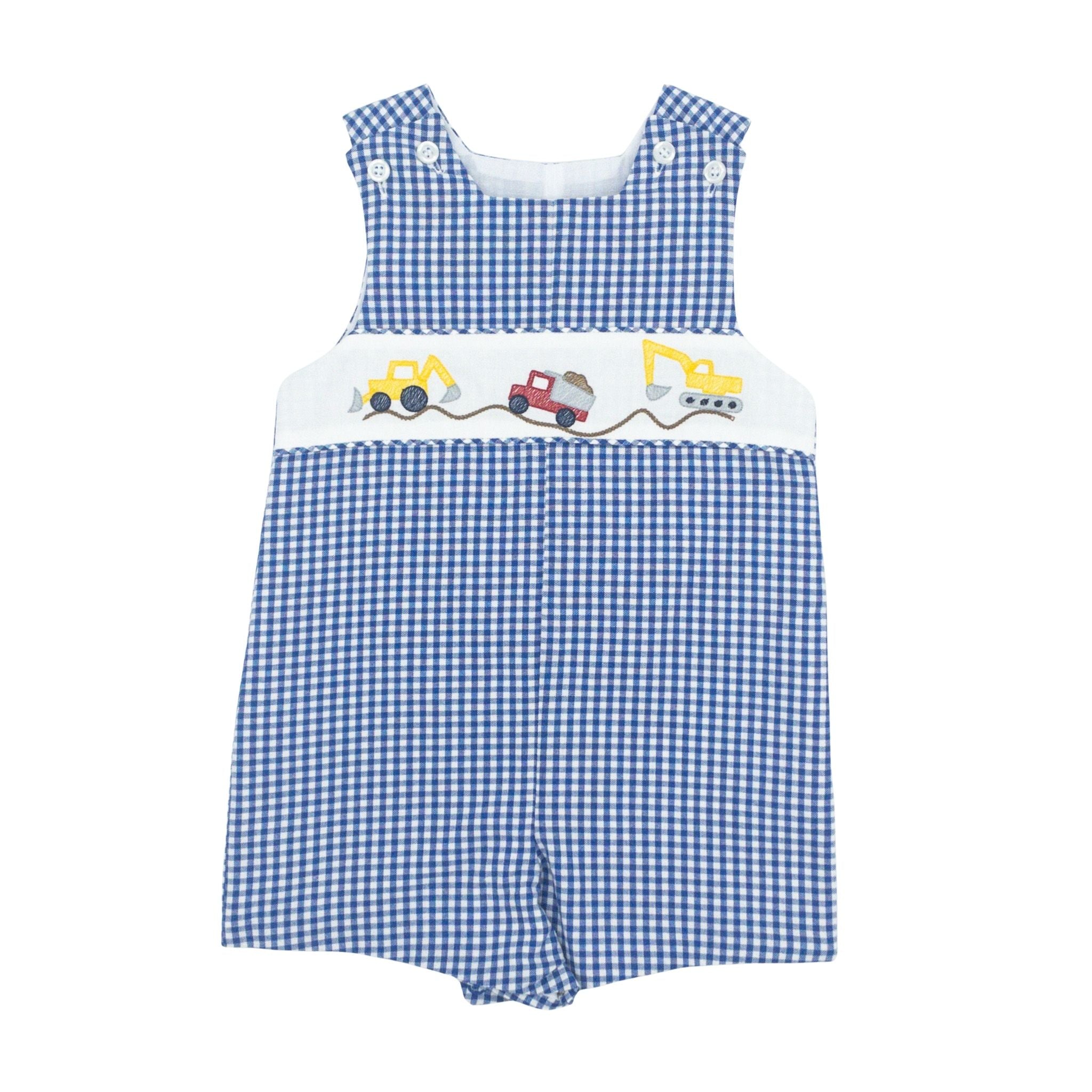 Introduce your little builder to the Lil Diggers shortall, where construction fun meets adorable style. This charming blue gingham piece features detailed embroidery of a backhoe, dump truck, and excavator—perfect for the pint-sized equipment enthusiast. Comfortable and durable, it's ideal for playtime or everyday wear. Watch him dig into adventure in this delightful shortall!