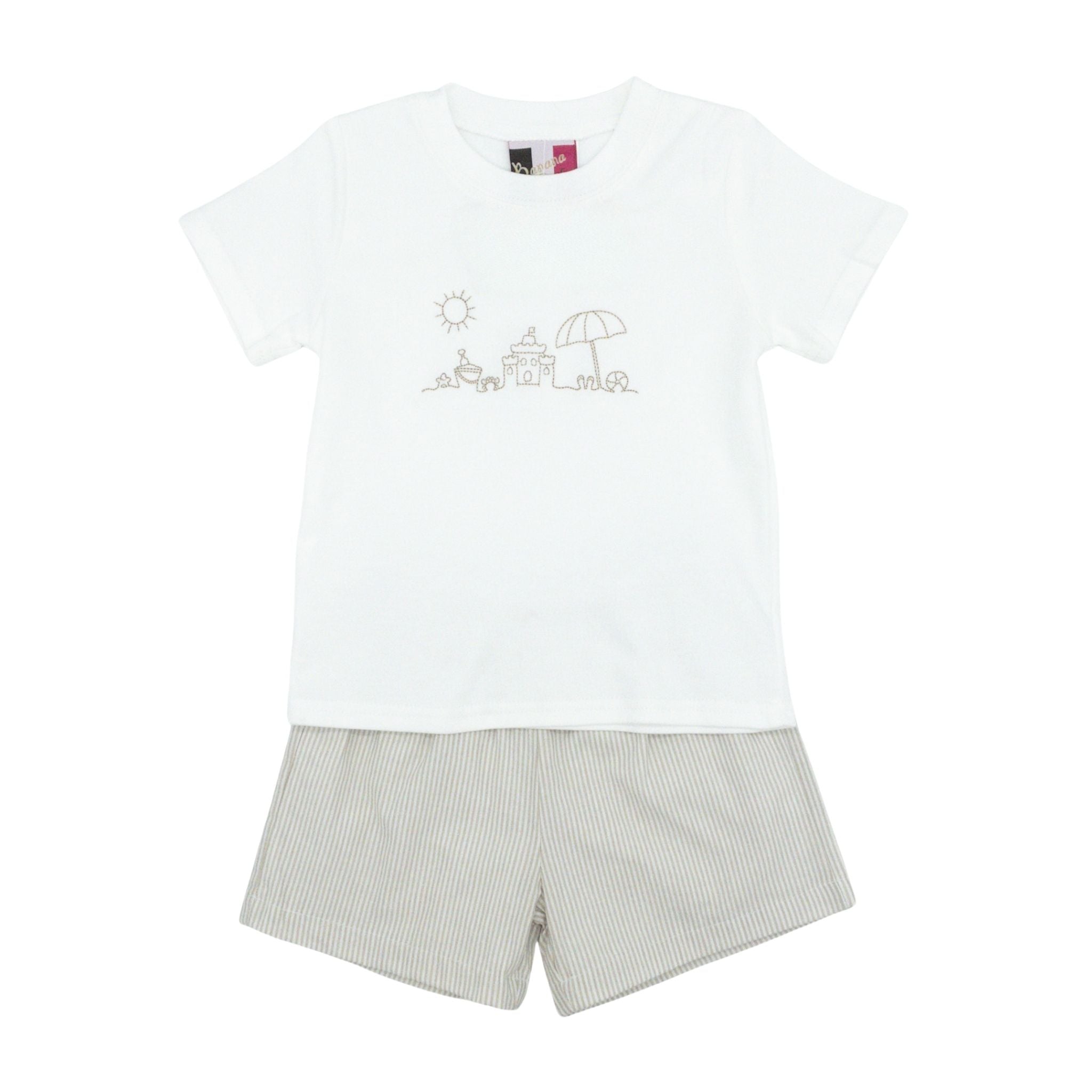 Dive into summer style with this Boys Short Set in tan stripe featuring delightful beach embroidery. The white knit shirt showcases a beachy scene complete with a sandcastle, umbrella, and bright sun—perfect for capturing the carefree spirit of a day on vacation. The tan striped shorts are a great coordinating touch! Ideal for little ones who love the sun and sand, this short set combines comfort with playful seaside flair that celebrates all the fun of summer adventures!