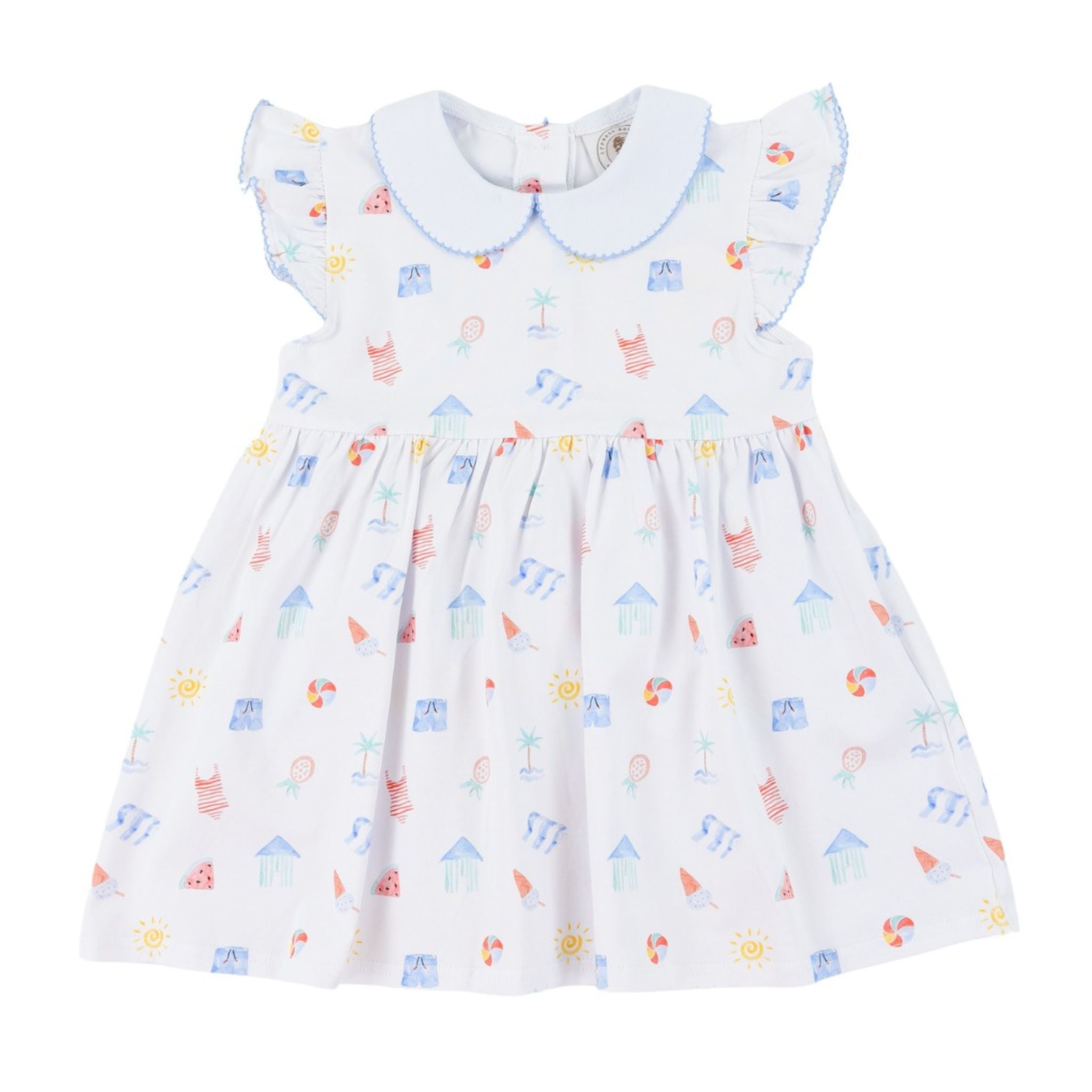 Dive into summer style with the Penelope Prep Dress in Saltwater Soiree print! This playful piece bursts with vacation vibes—think ice cream cones, tropical palm trees, sunny skies, fresh fruit, and retro bathing suits all dancing across the fabric. With a sweet collar and flutter sleeves trimmed in blue picot, this dress is her ticket to looking effortlessly summery no matter where she goes!