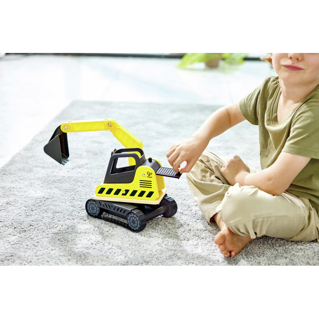 Give your little construction worker the right tools for the job with the Hape Dig n' Dump Excavator, a rugged and realistic wooden vehicle designed for imaginative play. This classic construction toy allows children to explore the world of building and engineering while developing their fine motor skills. The excavator features a 360° rotating cab and a movable shovel arm that can be operated just like the real thing, providing endless opportunities for creative and educational fun. Crafted from durable, sustainably sourced wood and finished with child-safe, non-toxic paint, this set includes not only the excavator, but also a wooden construction worker and a rock for more immersive play. With its easy-to-grip design and realistic rubber wheels, this Dig n' Dump Excavator is perfect for little hands to maneuver indoors or outdoors.
