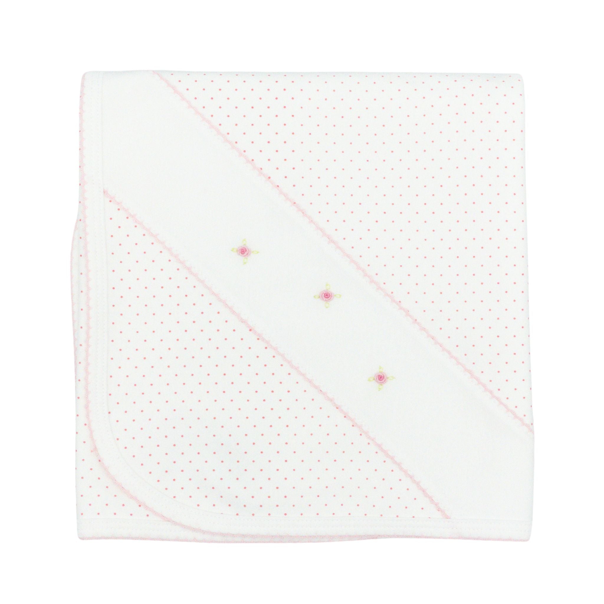 Wrap your baby in comfort and care with this beautifully crafted pindot blanket. Featuring a serene all-over pink design adorned with hand-embroidered rosebuds, it's a blanket you can feel good about choosing. Constructed from 100% Pima cotton, it's remarkably soft and cozy—ideal for sensitive skin and those precious moments of closeness. Each rosebud is individually embroidered with attention to detail, making this a meaningful heirloom piece that supports your baby's comfort through every stage.