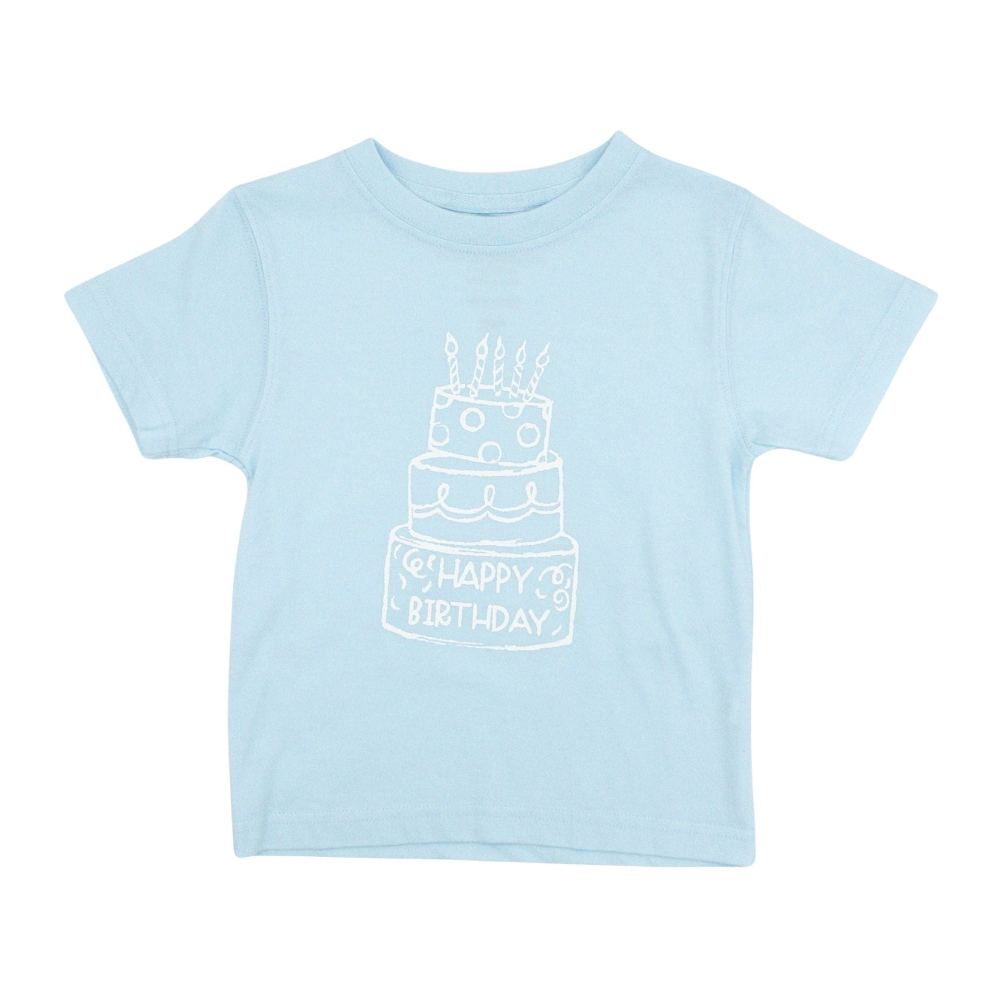 Celebrate in style with this cheerful light blue t-shirt featuring a fun birthday cake design. Perfect for parties and special occasions, this comfortable tee is ideal for your little boy. The playful cake graphic in white brings joy to any birthday celebration, making it a great choice for festive gatherings. Soft, durable fabric keeps him comfortable all day long while he enjoys the party in this fun shirt!