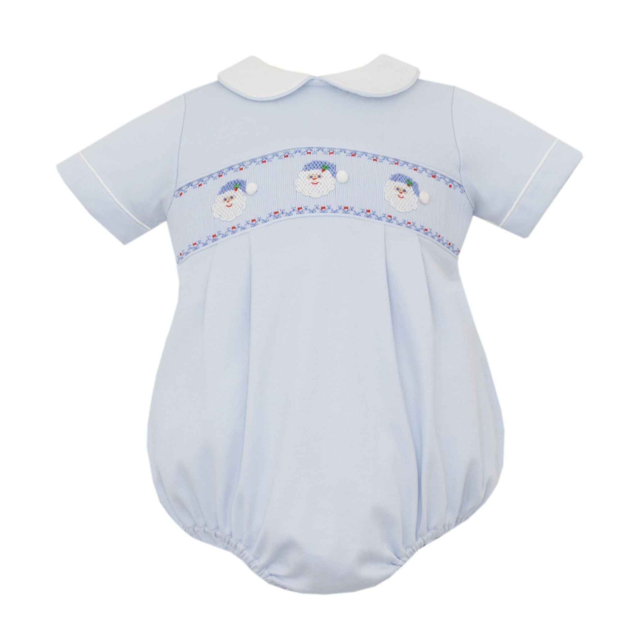 Our Boys Knit Bubble with Smocking - Santa Faces features soft baby blue fabric adorned with festive Santa face smocking, creating a cheerful holiday appearance. Complete with a classic white Peter Pan collar, this outfit adds both charm and comfort to your little one’s seasonal wardrobe.