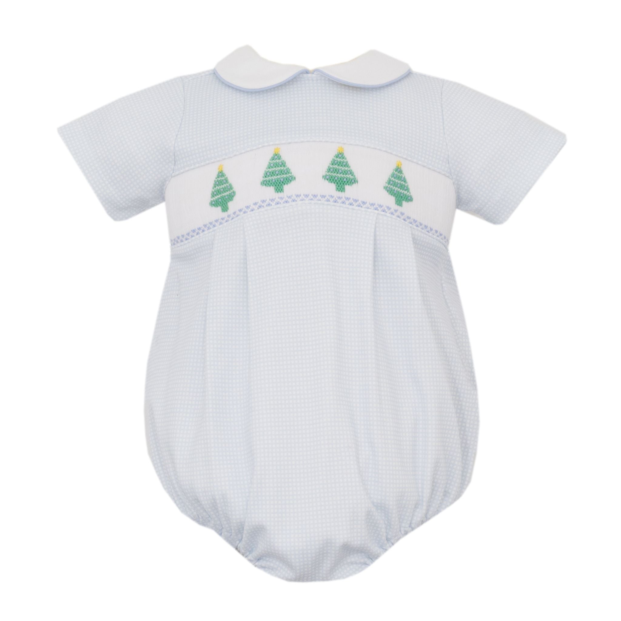 Our charming Boys Knit Bubble with Smocking - Christmas Trees features a soft pastel blue check fabric, perfect for cozy holiday moments. Adorned with festive Christmas tree smocking and a classic Peter Pan collar, it brings playful holiday cheer to your little one’s wardrobe. Ideal for celebrating the season in style and comfort.