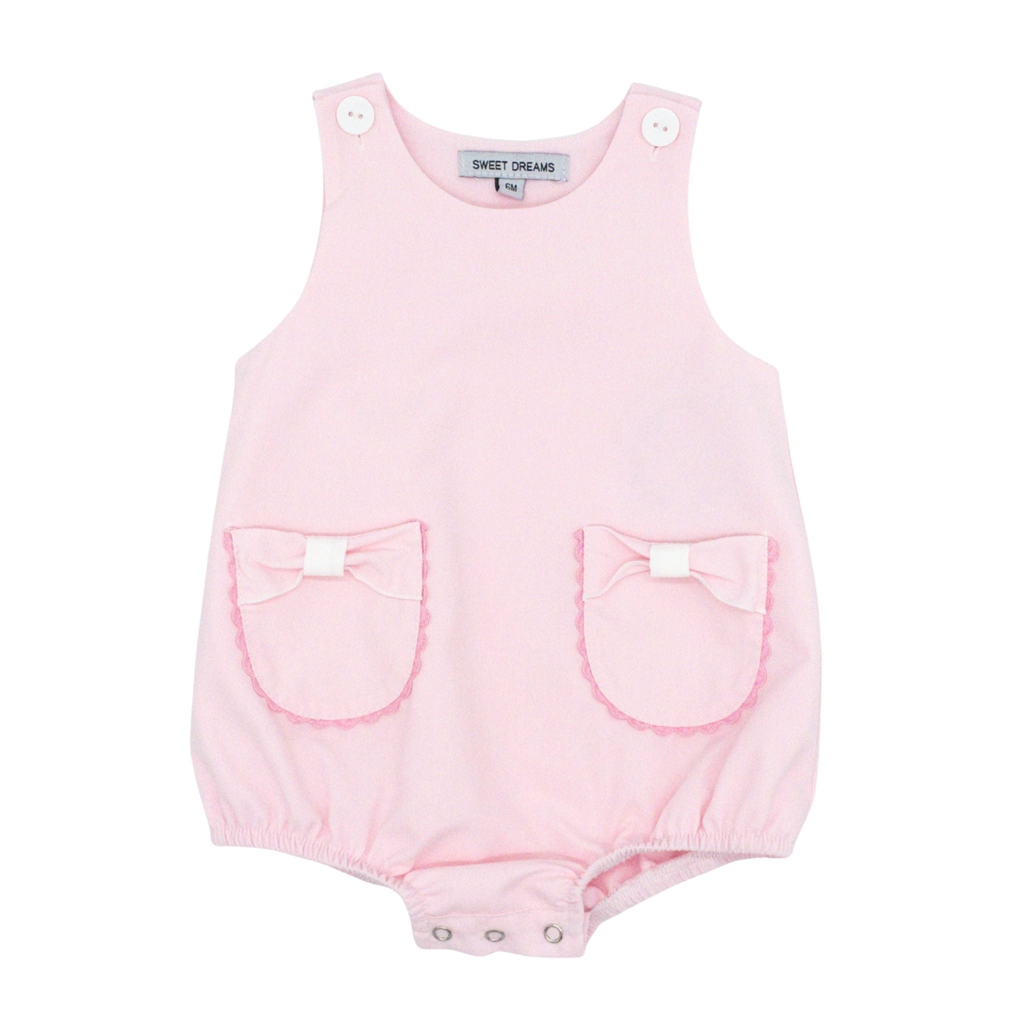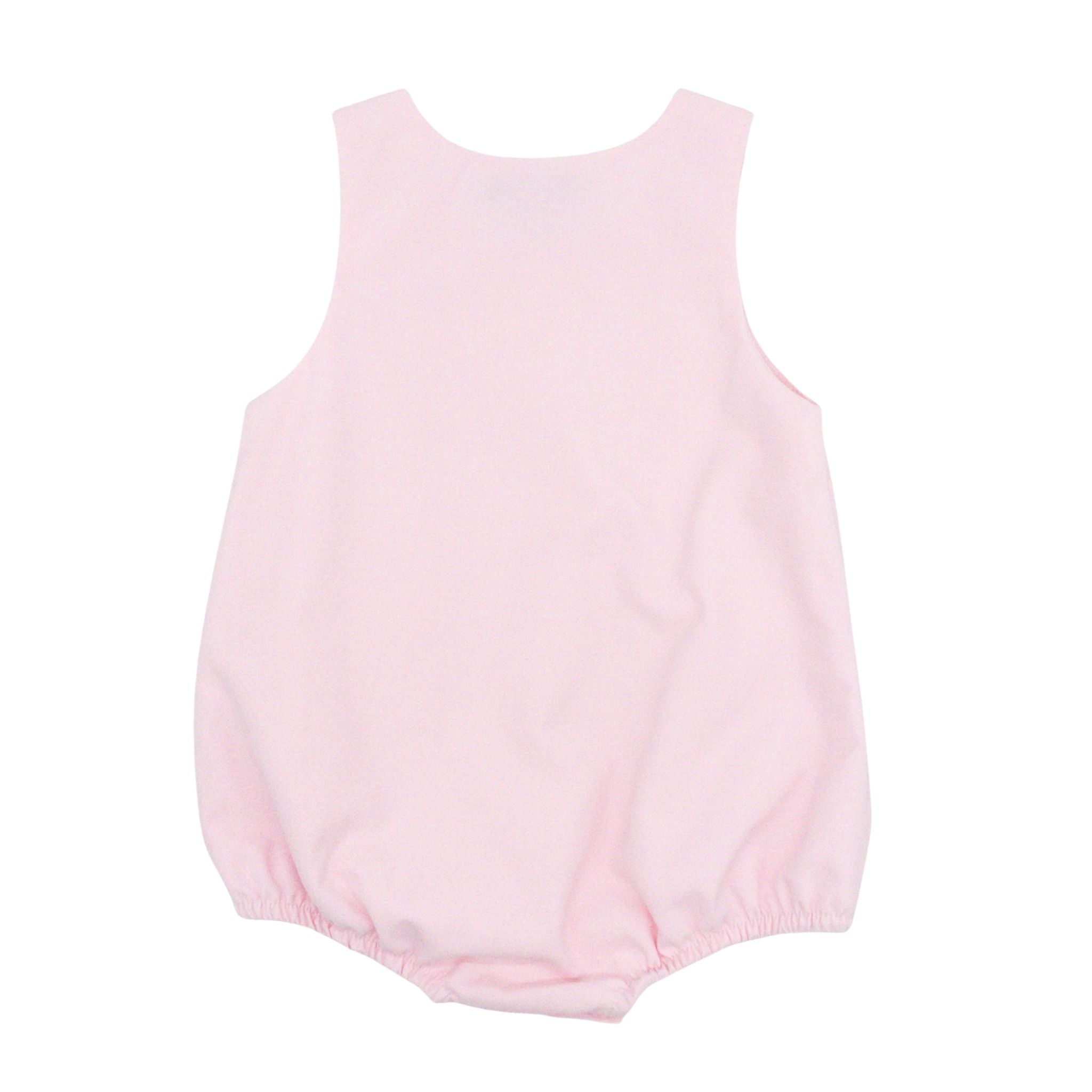 This darling pink bubble is perfect for your little one's spring and summer wardrobe! The woven fabric features adorable bow pockets on the front, each accented with sweet pink ric rac trim, while shoulder button closures add a delightful finishing detail. For an even sweeter touch, add a personalized monogram to the front! Versatile and comfortable, this fully lined bubble is ideal for everything from casual playtime to special occasions. A timeless piece that celebrates her sweet style!