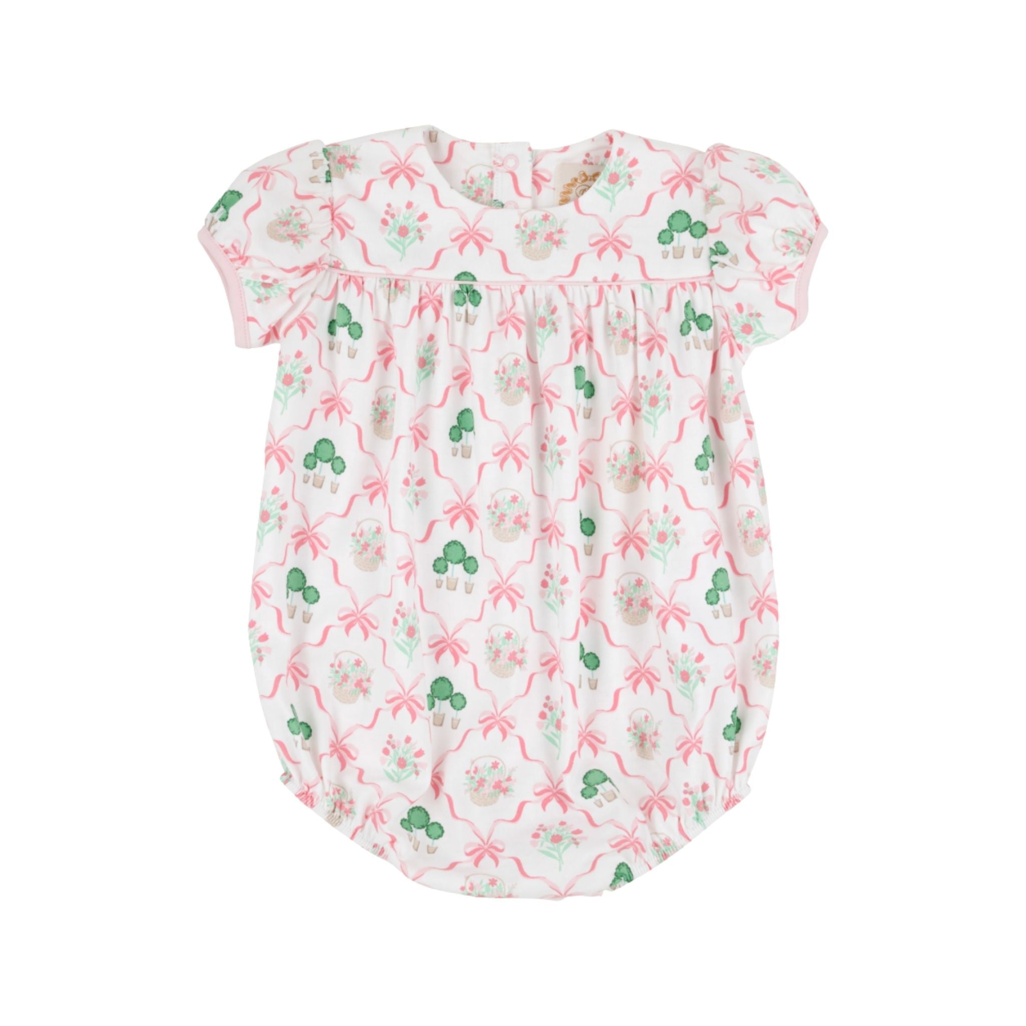 Capture hearts with the Blythe Bubble featuring the elegant Boxwoods & Bows print beautifully accented with Palm Beach Pink trim, designed with a sweet bubble silhouette perfect for your little one. Expertly crafted from premium fabric with charming details and a comfortable fit, this adorable one-piece is ideal for creating cherished memories. A timeless wardrobe favorite that brings classic elegance and effortless style to every celebration.